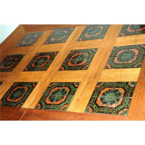 Dining Table of solid Philippine Mahogany inlaid with Spanish Tiles. The table top has been refinished. <p> The table can break down for shipping or storage. The two halfs seperate and the legs are bolted on. There is not a center leaf. The condition is great. There a bit of warping on the table top towards the joining of the two halves. The table is much older than the tile work. I assume that was done later as a project on a table. Who ever did the work did a nice job. The bottom has a plywood layer that is needed to support the tiles.