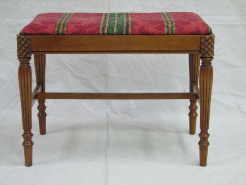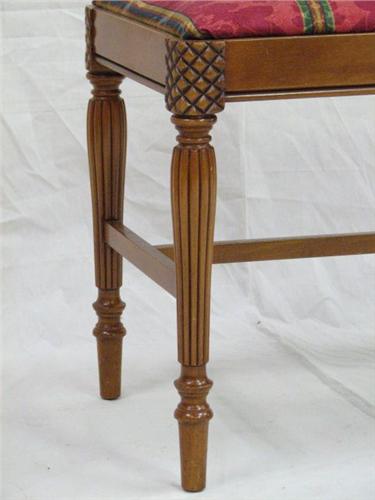 Solid Maple Vanity Bench, Paine Furniture, Boston, MA. Vintage, over 50 years old. Featuring brocade fabric seat with carved pineapple motif corners supported by turned and reed tapered legs with H stretcher. No damage noted. Dimensions: 18.35"H x 24"W x 14.5"D.