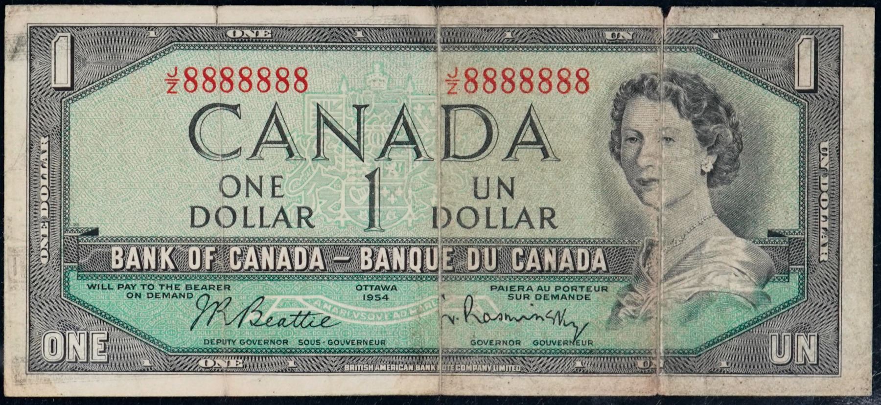 Solid Number; 1954 $1 BC-37b-i #JZ88888888, LCG Choice Fine-15 w/edge splits.