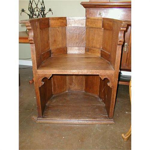 Alcove chair could have been in the local church. Very simple construction. Faceted panels back. Straight across the front. Simple detail in front in corners and arm rest.