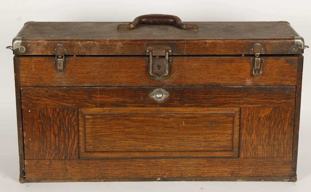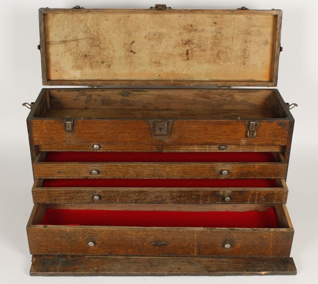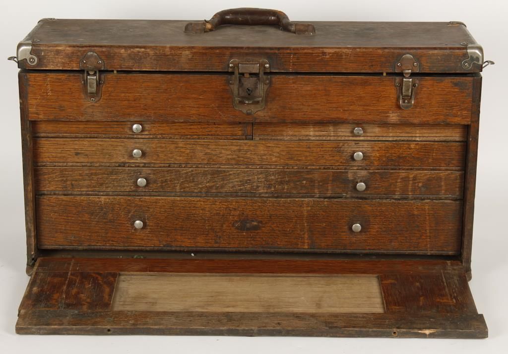 With metal components. Top hinge opening lid. Front pull down door opens to reveal (5) drawers. In aged condition with scratches and damage to front pull down door. Restorable. Approx 26-1/2" long x 8-1/2" wide 14" high.