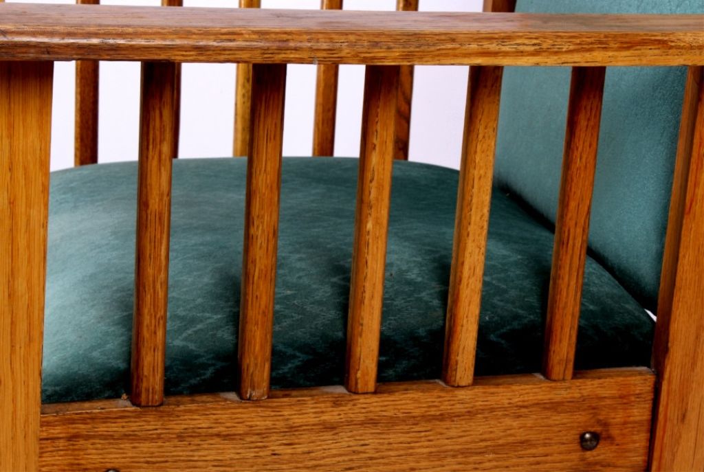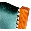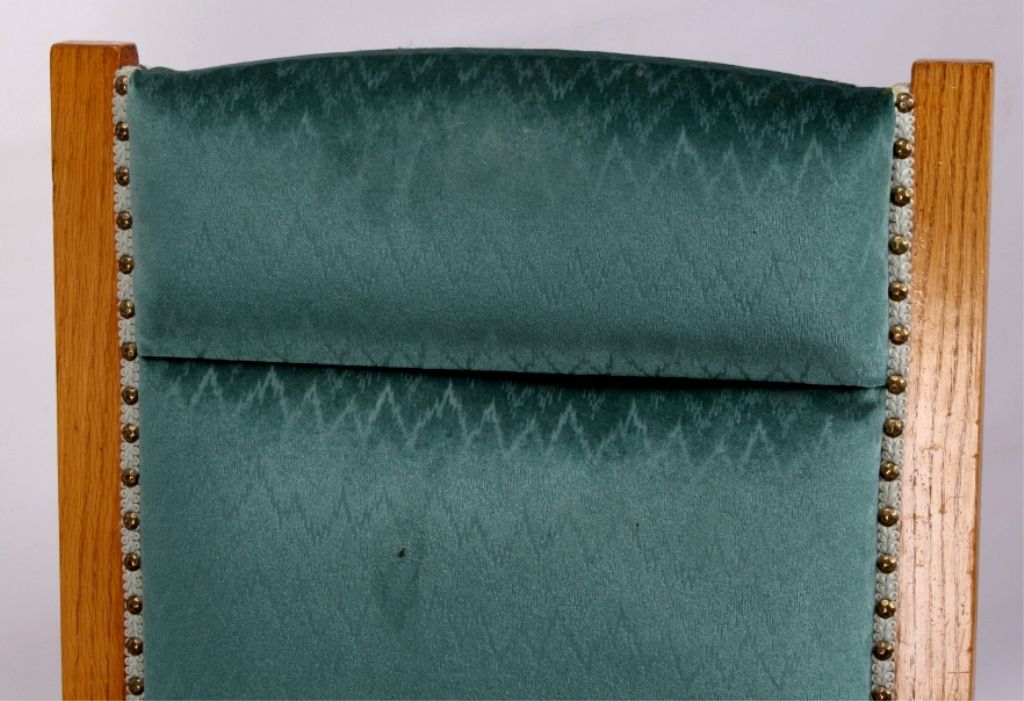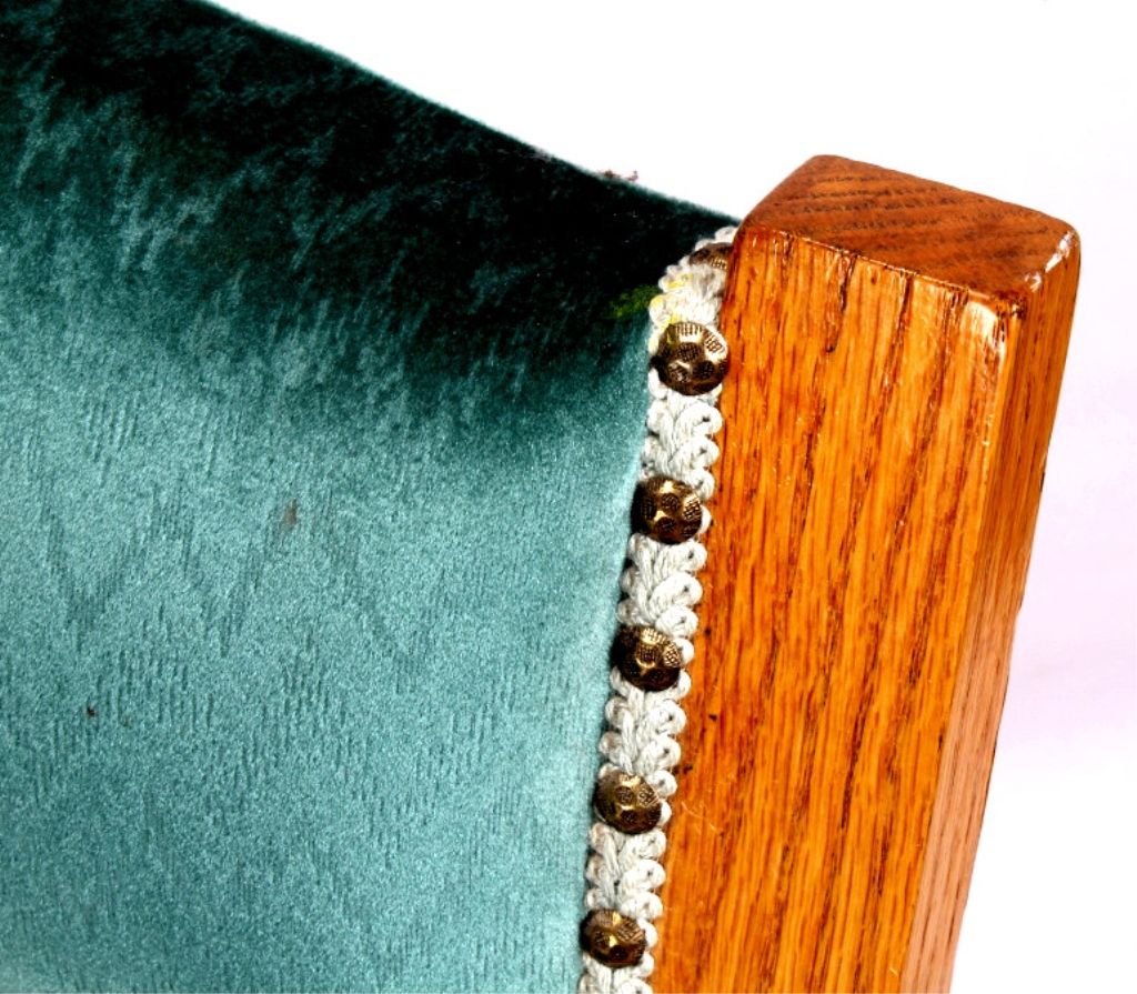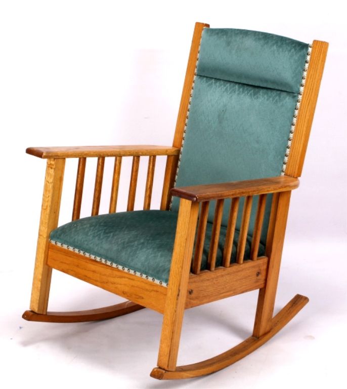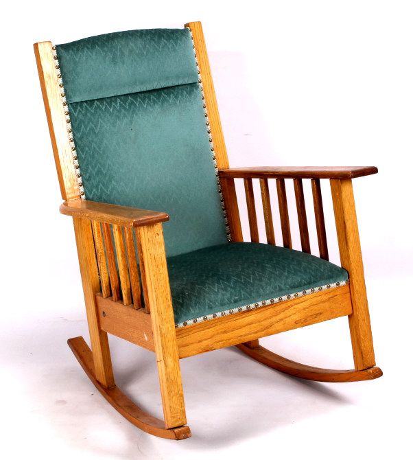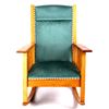 This lot features a solid oak rocking chair. It is upholstered with a unique velour fabric. The chair is in very good condition. It measures 29" x 31" and is 39" tall.