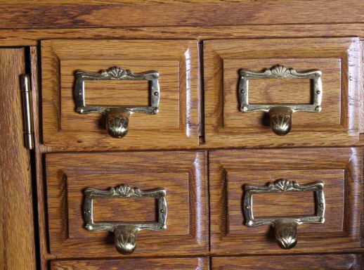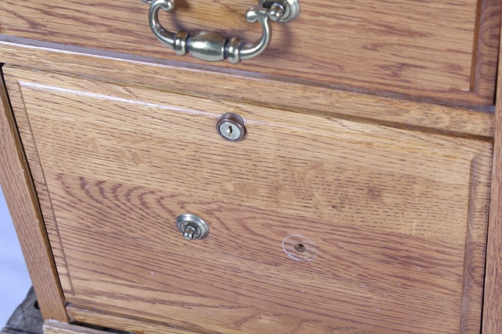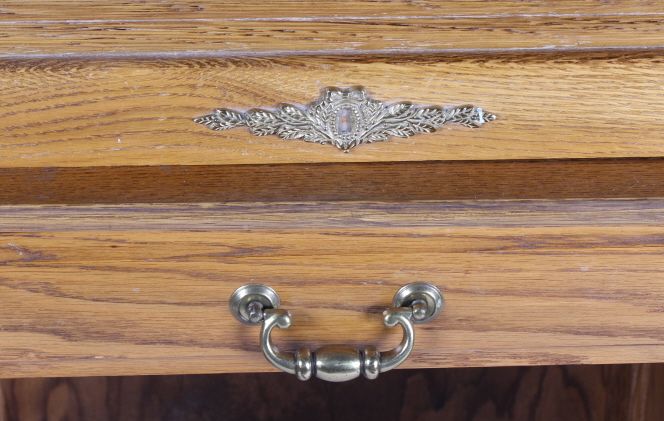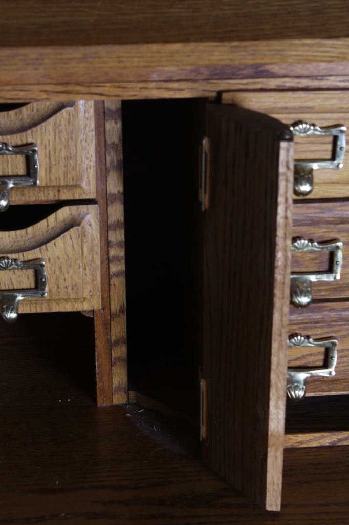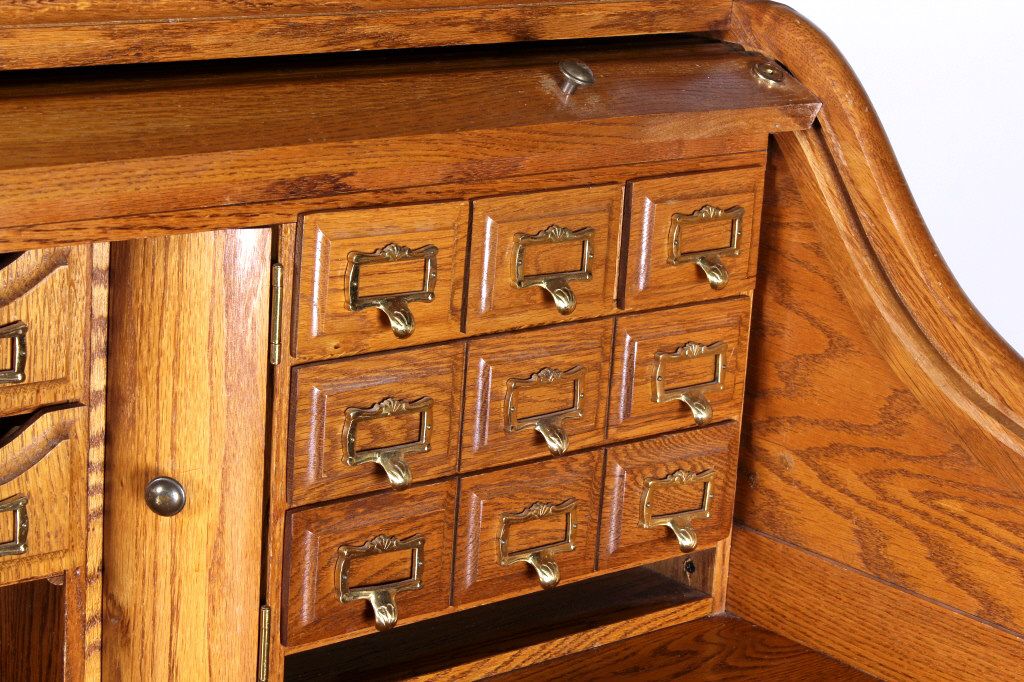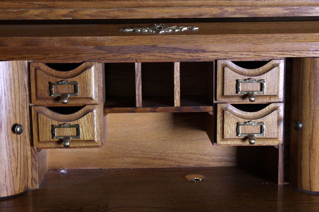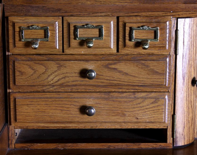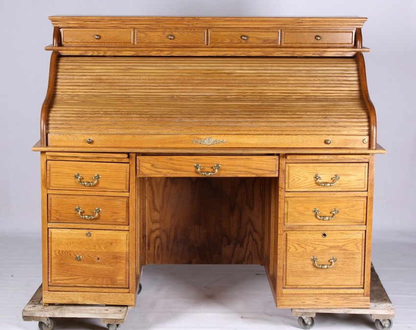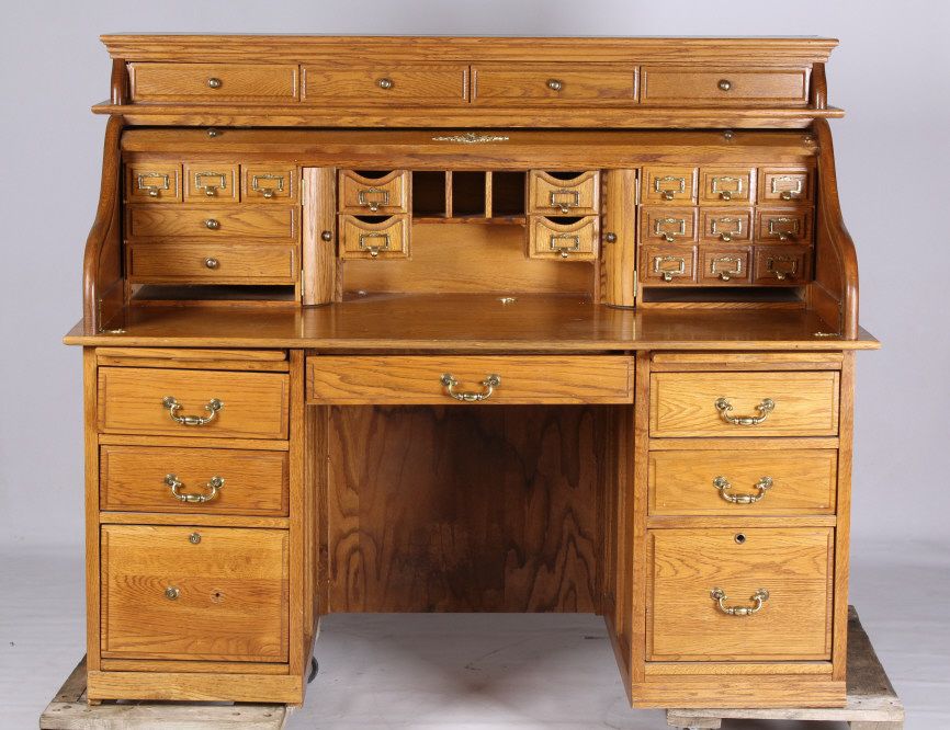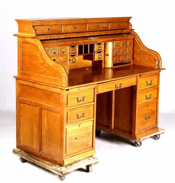 This is a well crafted roll top desk showing solid oak construction pieces. The roll top does work and shows all of the small compartments. The desk has brass hardware and a unique top drawer area. Some trim missing on left side. The desk measures 60"w x 28.75"d x 50"t. (carts in pictures are NOT included in this lot).