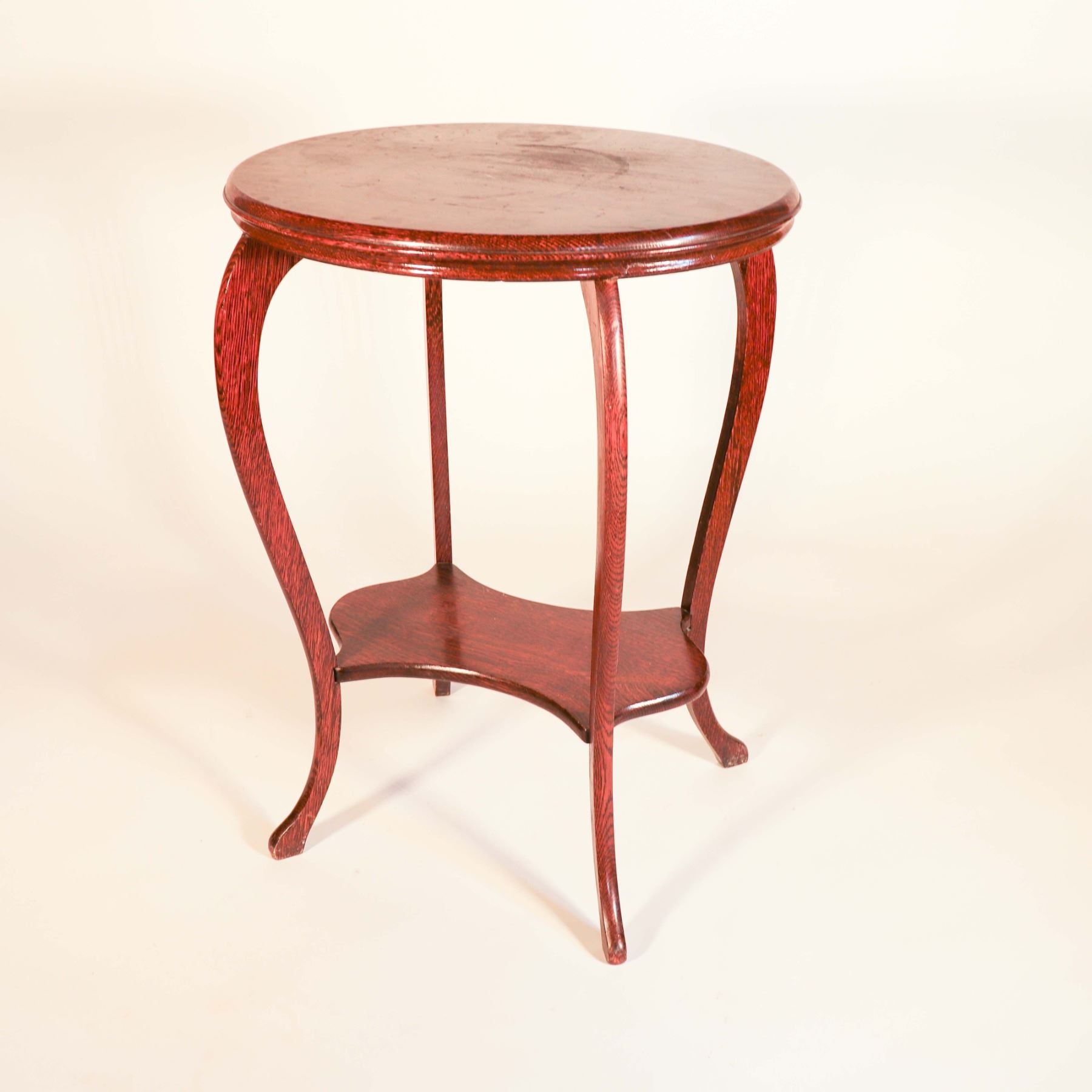 Solid oak occasional table with circular top, curving supports, and shaped undertier. Surface wear and marks to the top consistent with use.