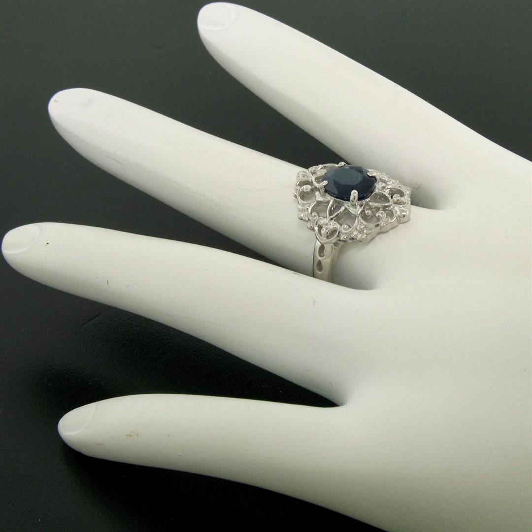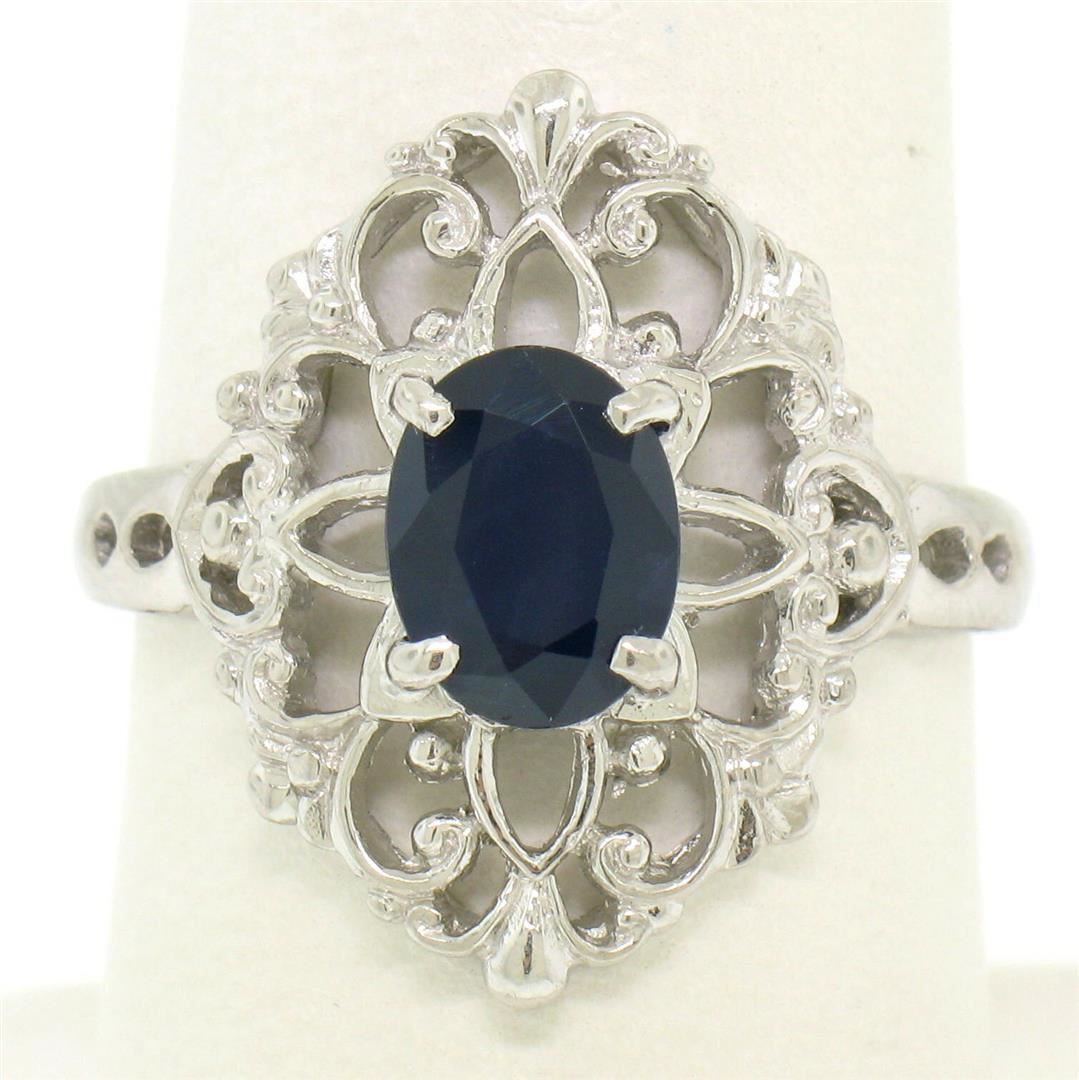 One Solid Platinum 1.22ct Oval Deep Blue Sapphire Solitaire Open Filigree Style Ring. Item Details: Material: Solid Platinum, Weight: 5.5 Grams, Stone(s): (1) Natural Genuine Sapphire - Oval Cut - Prong Set - Deep Blue Color - 1.22ct (approx.), Total Carat Weight: 1.22 (approx.), Ring Size: 8.0 (We can custom size this ring.), Ring Width: 19.62mm, Ring Height: 4.79mm rise off the finger, Condition: Like New!