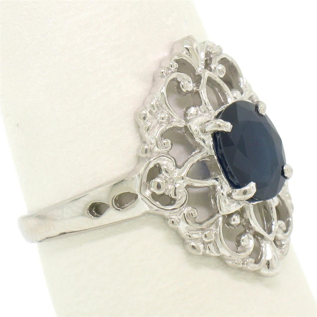 One Solid Platinum 1.22ct Oval Deep Blue Sapphire Solitaire Open Filigree Style Ring. Item Details: Material: Solid Platinum, Weight: 5.5 Grams, Stone(s): (1) Natural Genuine Sapphire - Oval Cut - Prong Set - Deep Blue Color - 1.22ct (approx.), Total Carat Weight: 1.22 (approx.), Ring Size: 8.0 (We can custom size this ring.), Ring Width: 19.62mm, Ring Height: 4.79mm rise off the finger, Condition: Like New!