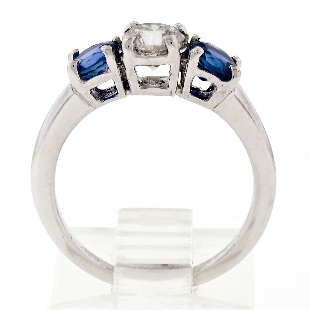 An estate solid platinum 3 stones band ring, featuring 1 round brilliant cut natural diamond (G - VS1; 0.52ct ), and 2 round brilliant cut natural sapphires (0.80ctw). The ring is size 4.5, weighs a total of 3.85 grams, and measures 5.0mm wide.