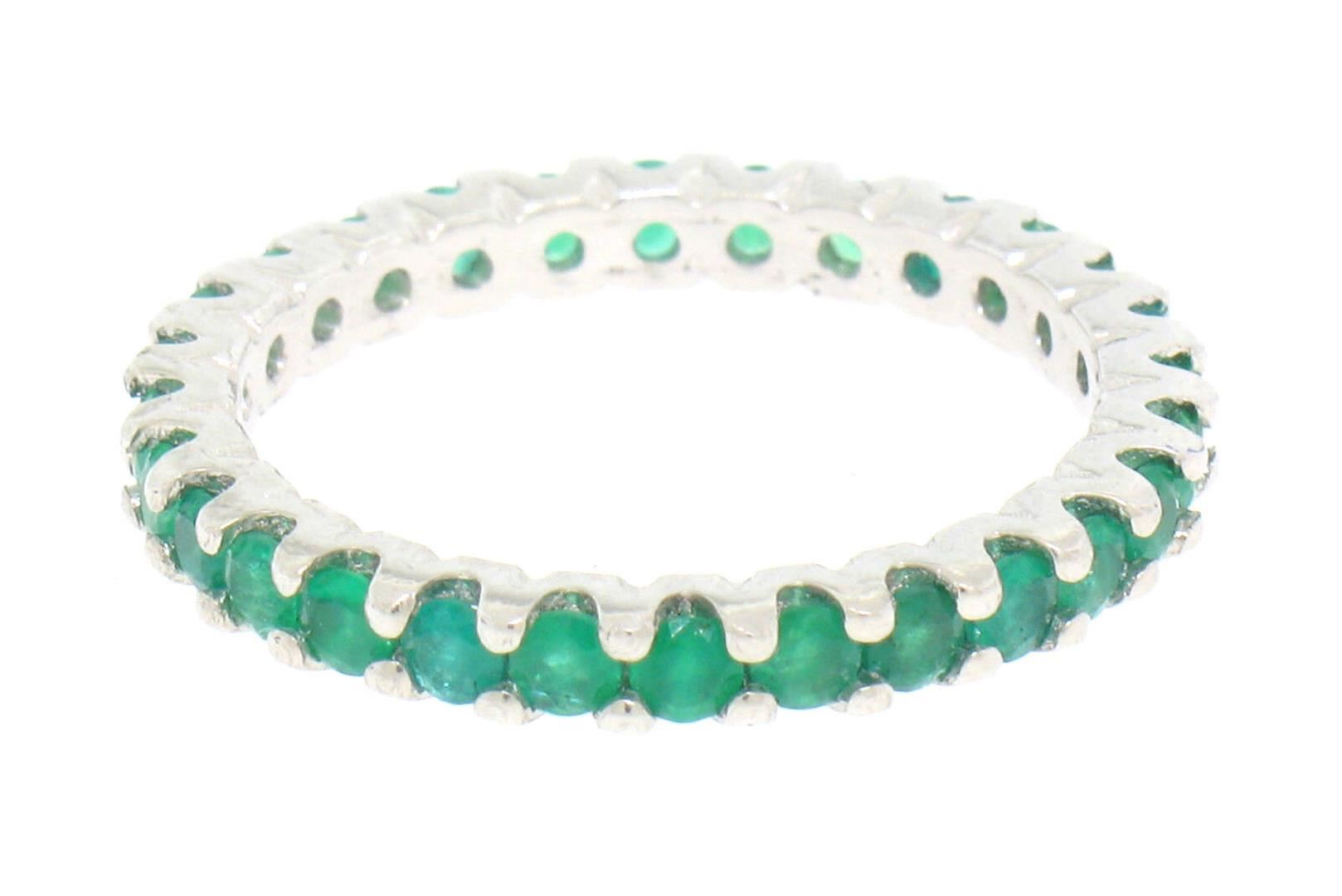 A new solid platinum eternity band ring, featuring 28 rounf brilliant cut natural emeralds (1.34ctw). The ring is size 6.5, weighs a total of 4.0 grams, and measures 2.64mm wide.
