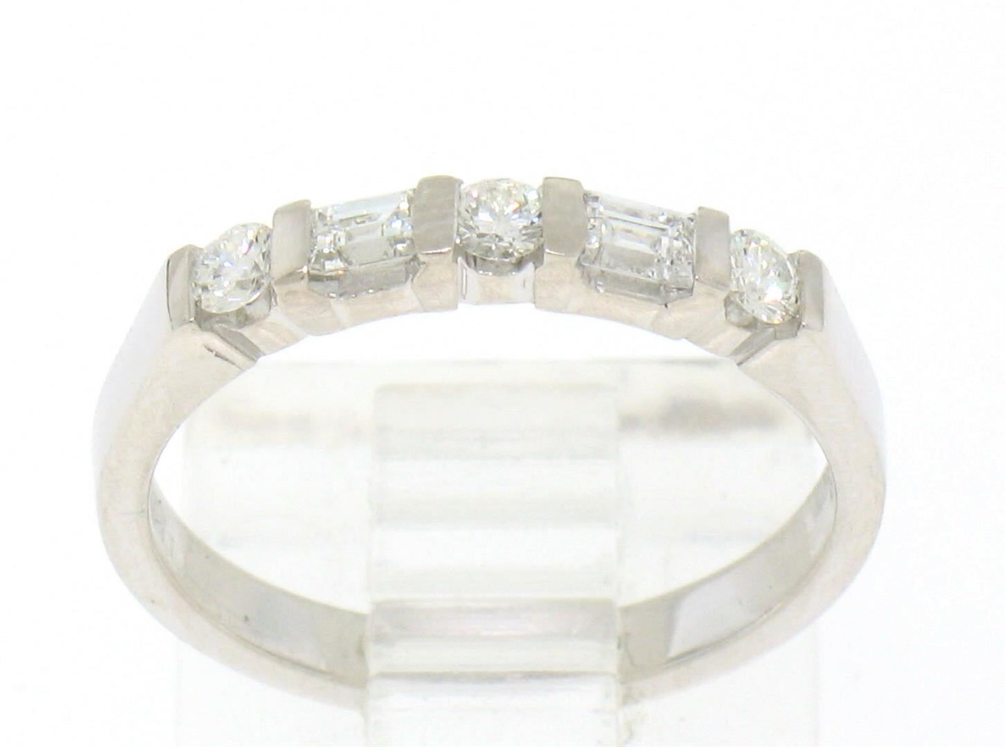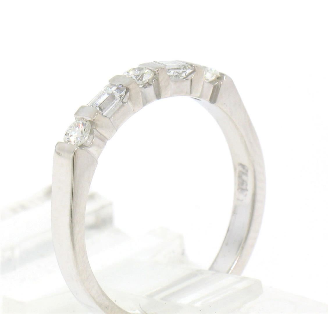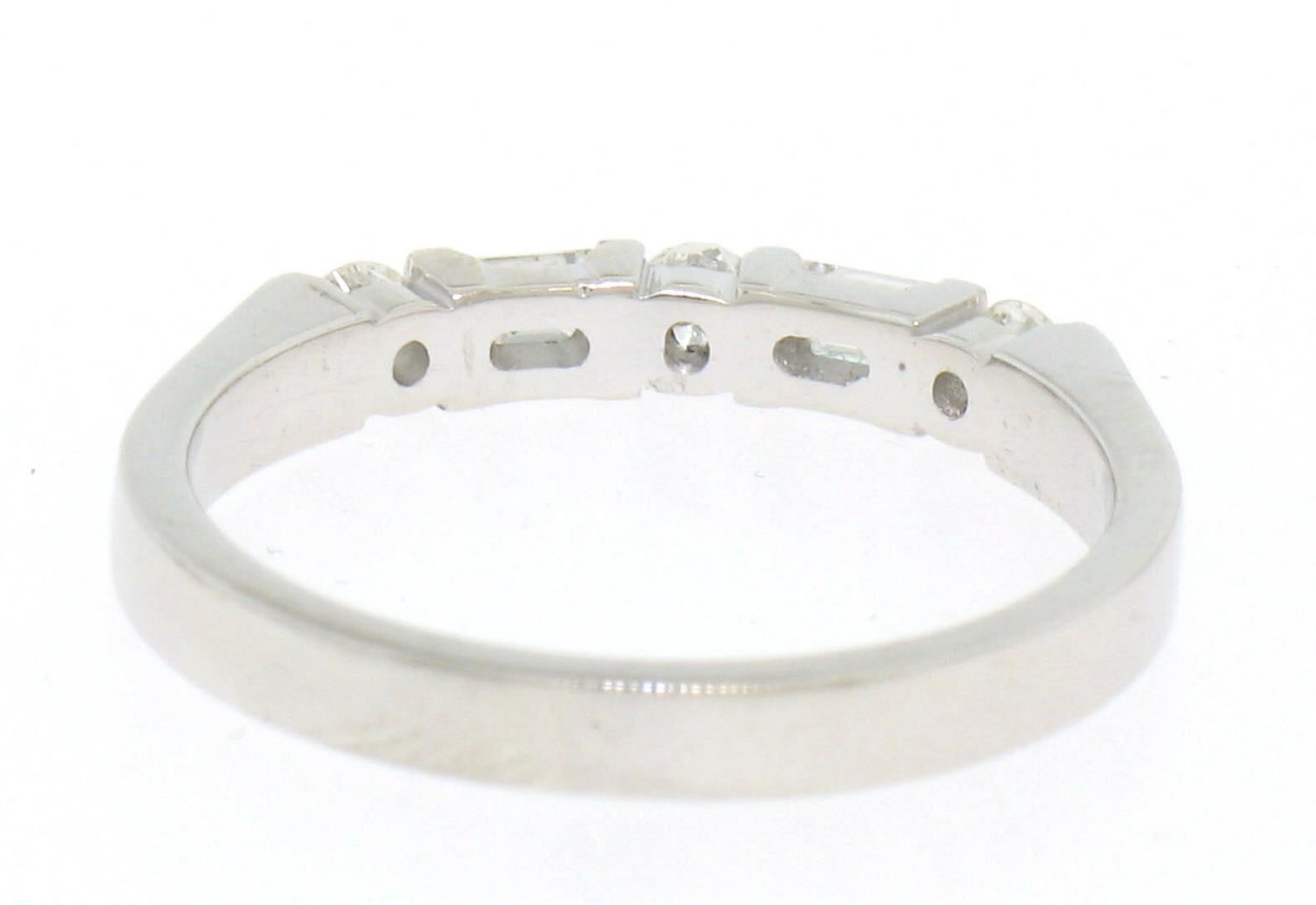 One Solid Platinum Alternating VS1 G Baguette and Round Diamond Band Ring. Item Details: Material: .950 Solid Platinum, Weight: 4.0 Grams, Stone: Natural Genuine Diamond (5) Baguette and round diamonds alternate. There are 3 rounds and 2 baguette. Channel Set. Diamonds total .30ctw. They are VS1 Clarity and G Color., Dimensions/Size: Top of the ring measures 2.50mm wide. Ring is a size 6, we can custom size!, Condition: LIKE NEW