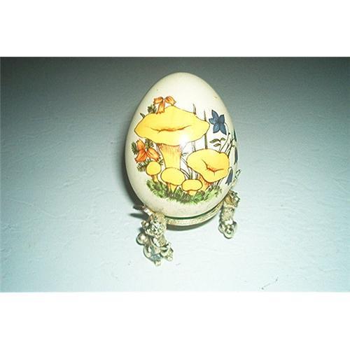 Very pretty Solid Porcelain Egg with gold toned stand which has three legs designed as rabbits. The egg is painted with yellow mushroms and blue and orange colored flowers. Creamed colored background. Hand Painted. Maker unknown. Measures with stand: 3 3/4 inches tall; diamter is 2 3/4 inches; height measures is 3 inches. A piece of green felt is located on the bottom of the egg. Excellent condition for it's age.
