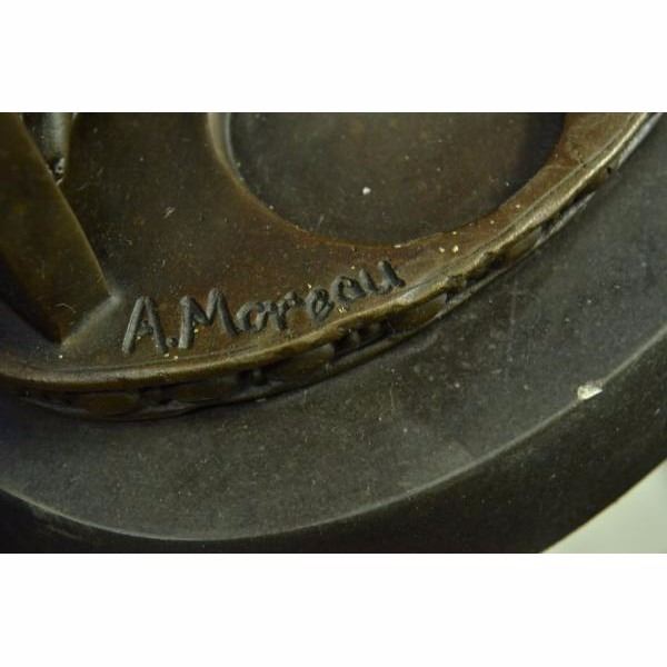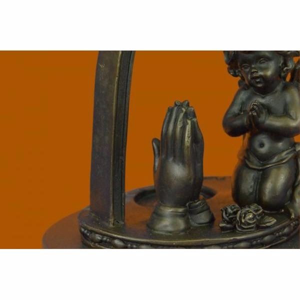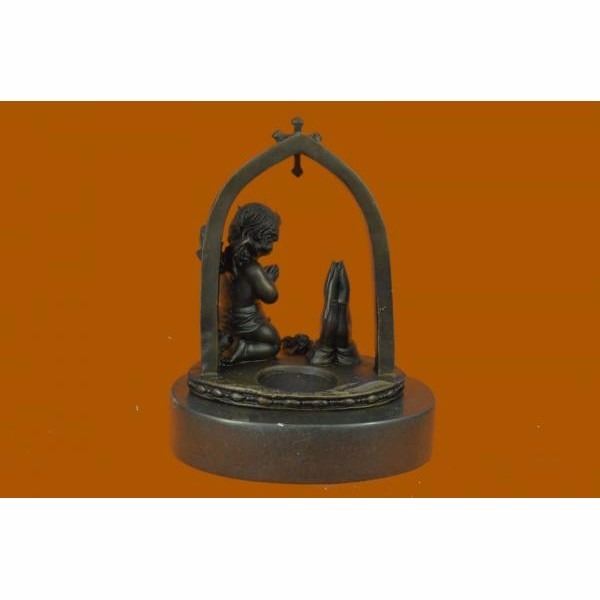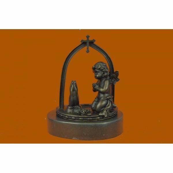 The Praying Angel Bronze Statues are made from solid and the finest bronze available. The bronze statues are manufactured in Spain by some of the finest bronze experts in the world. All of our bronze statues are made to order by these talented artisans. The magnificent detail in each statue shows the true artist at work. The art of bronze sculpting is passed on from generation to generation, making it perfect for a long lasting, fitting memorial. Bronze Statues are not just used in cemeteries, we have them going to ranches and public buildings, homes and many other places. 100% bronze and handmade, this sculpture was cast usingthe “Lost Wax Method†and is mounted on a round black marble base,signed by the artist Moreau. Condition : This sculpture is in perfect condition. Bronze Dimensions with Marble Base:Height 8" x Width 6" Marble Dimensions:Diameter 6" Height without base: 7" Weight : 7 LBS Inventory : 43YRD12735734