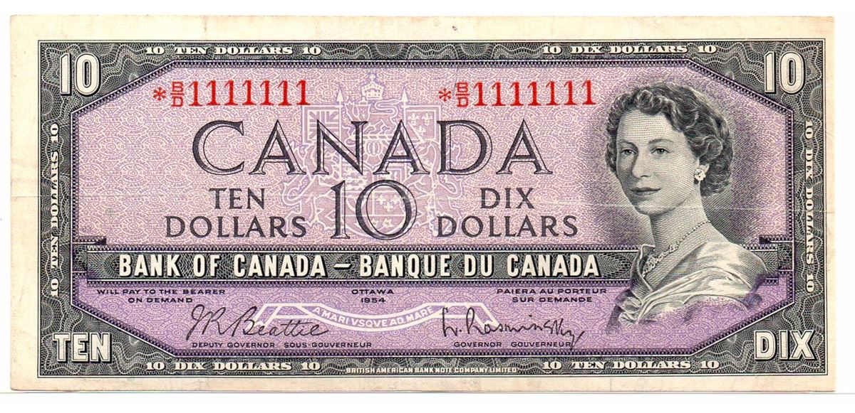 Solid/Replacement; 1954 $10 BC-40bA #*BD1111111, CCCS F12.
