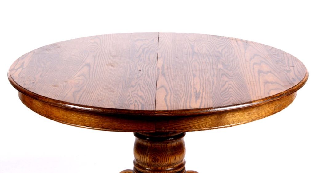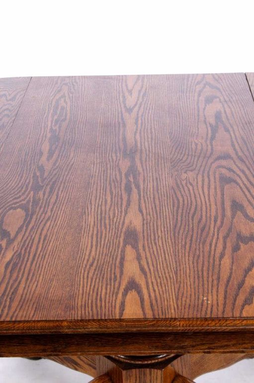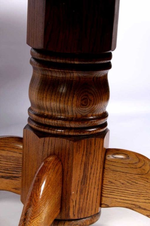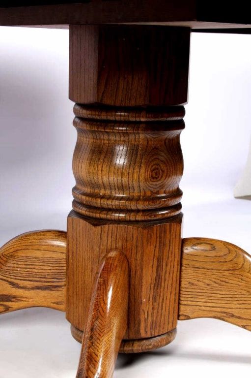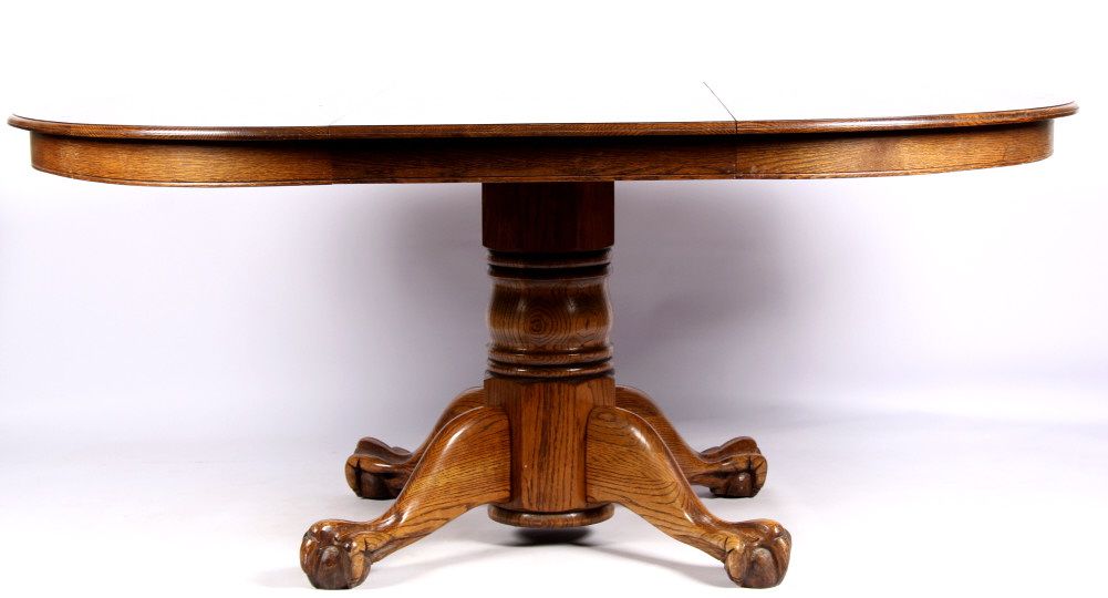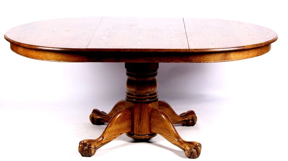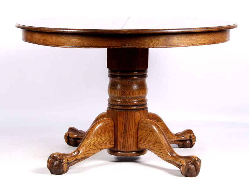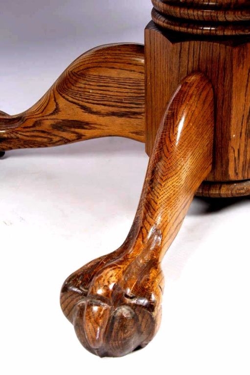 This lot features a solid round oak table. It has carved claw feet. This beautiful table is in fantastic condition. It has one leaf that is 24" wide. The table is 48" in diameter. With the leaf in, it is 72".