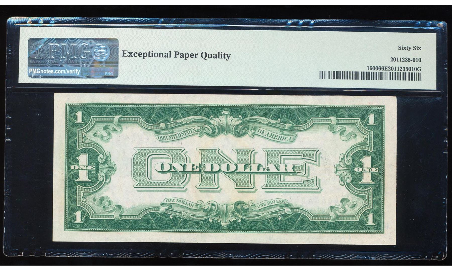 One Solid Serial Number 1928 $1 Funnyback Silver Certificate Note PMG Gem Unc. 66EPQ. PMG Certified.
