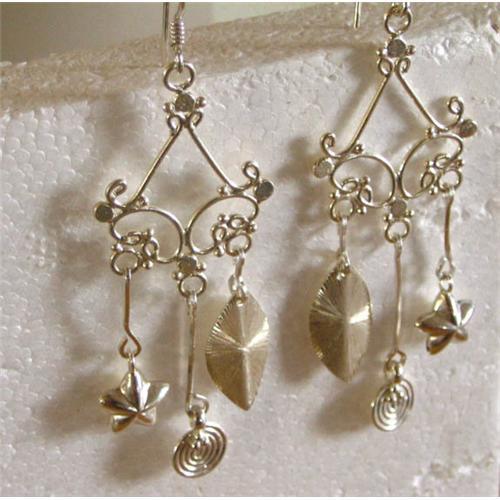 A beautiful mix Bali sterling silver. These great hand crafted earrings are solid sterling. Star, circle of life and a groovy kewl leaf charm all adorn this beautiful shiny chandelier using sterling silver square wire for great movement.<p>At almost 3 inches long, you will wow'um all with these bright beauties! These are suspended from Bali sterling french hook earwires.<p> Shine on