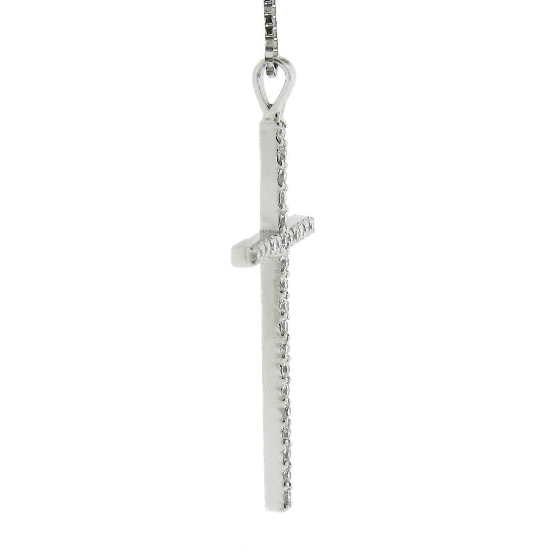 A solid 14k white gold cross pendant necklace, with numerous of round cut natural diamonds (G/H - VS2/SI1 ; 0.30ctw). 18 inch box link chain, 3.11 grams total weight, pendant measures 34.7x18.1mm.