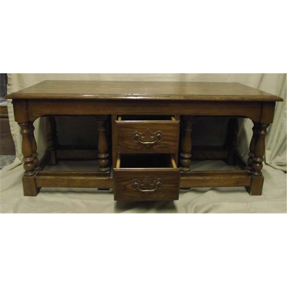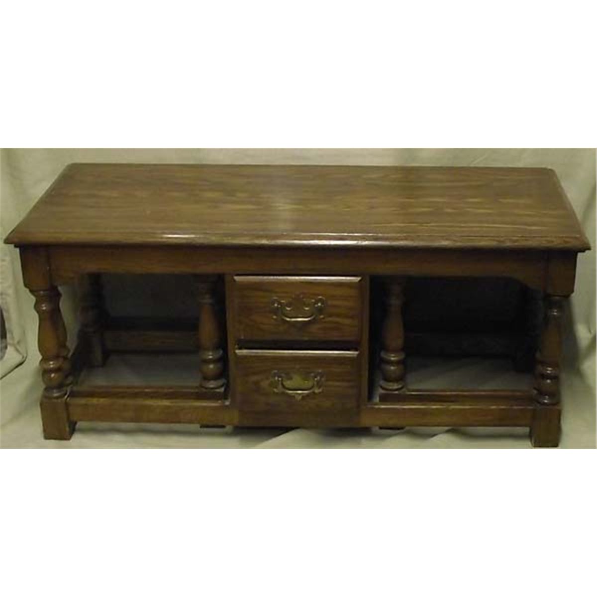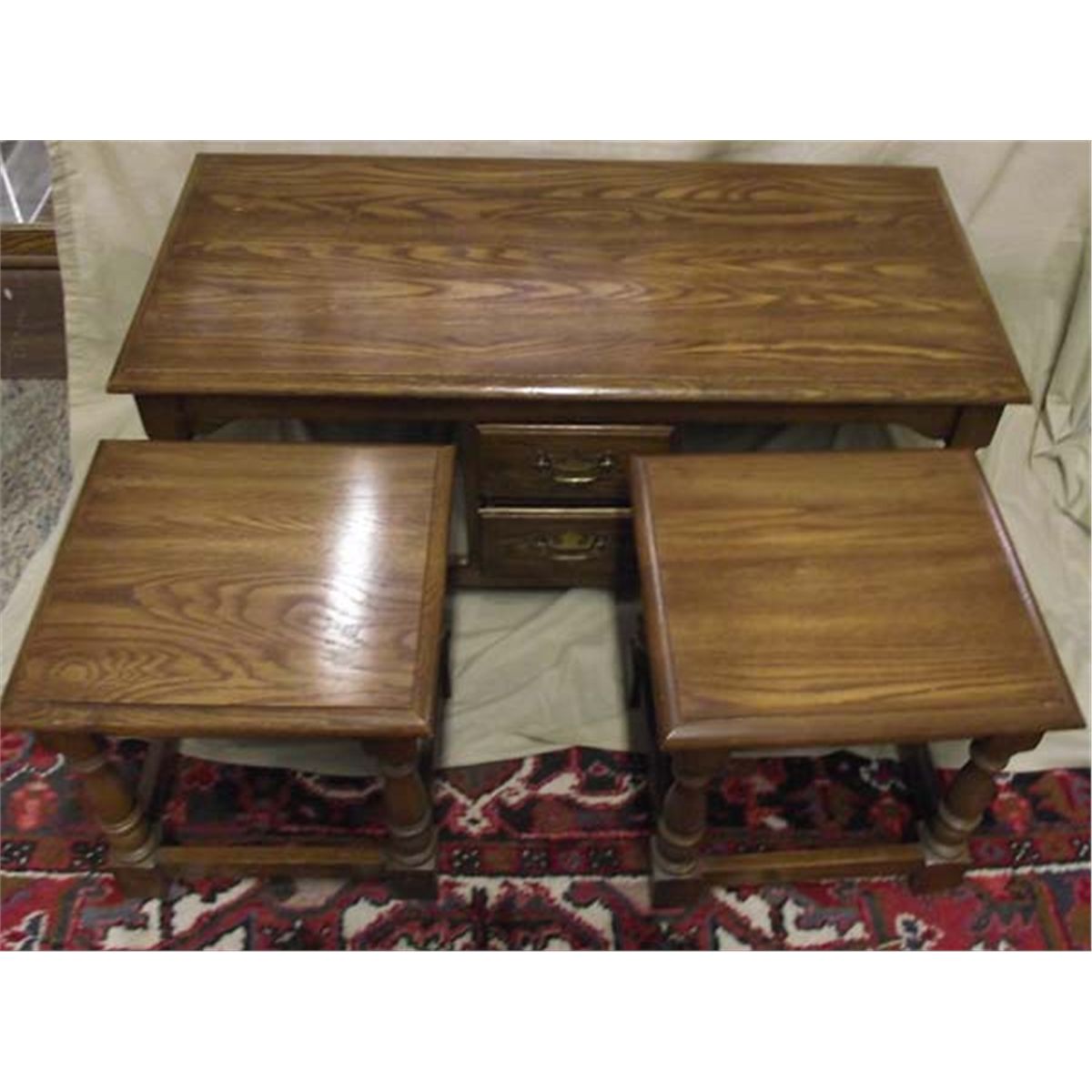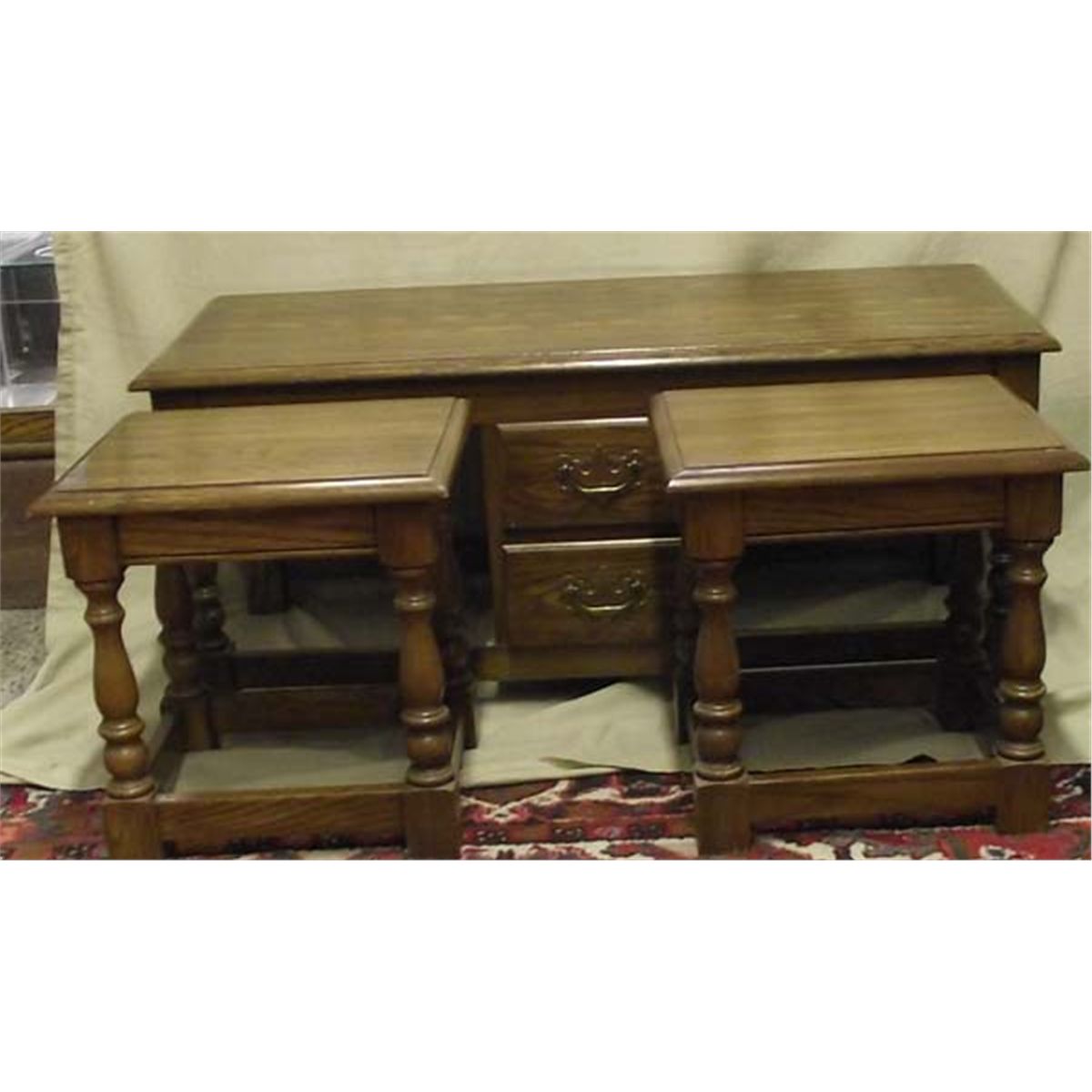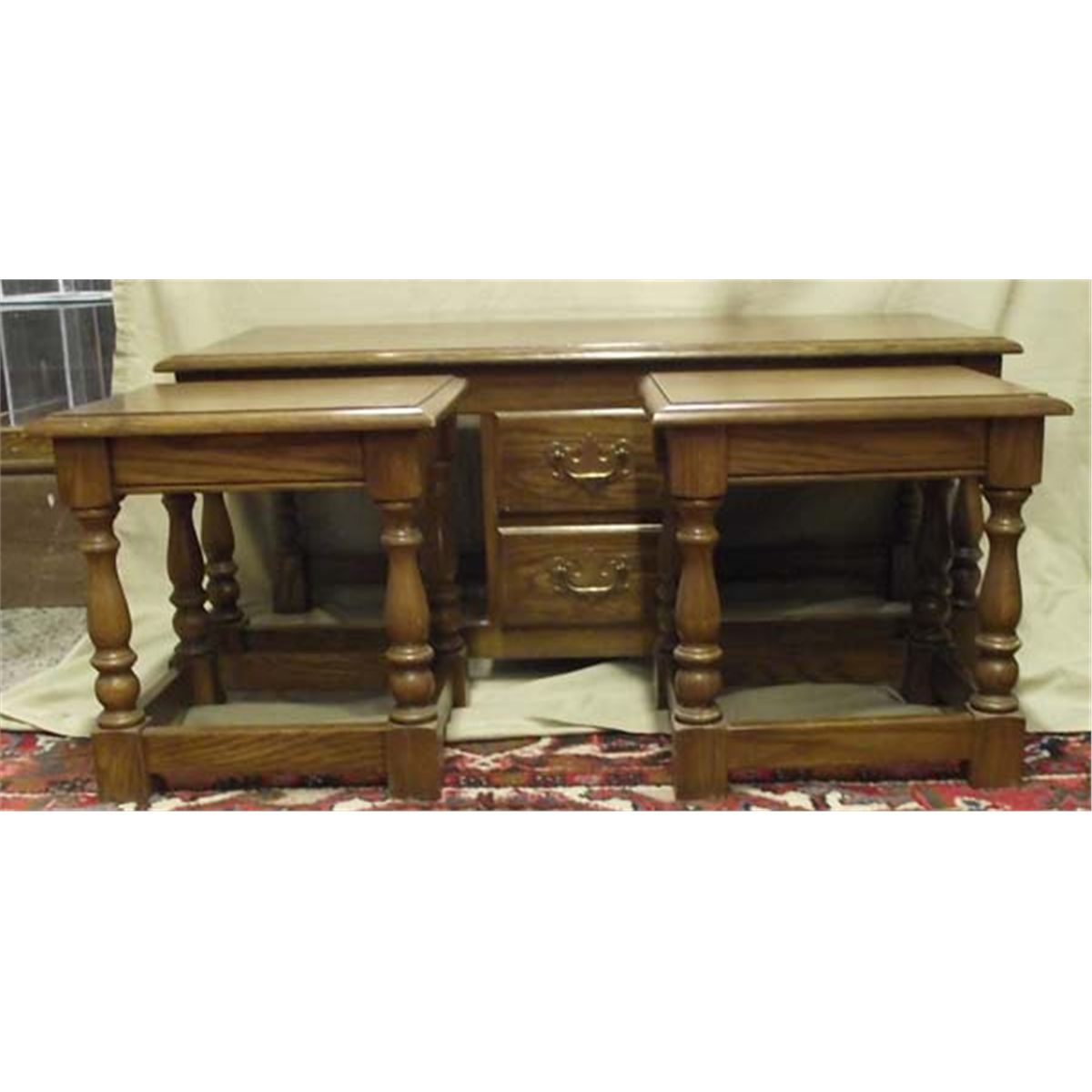 Vintage Pennsylvania House Solid Oak Wood Coffee Table. Has scratches and wear. Measures approx. 16 1/2"H x 40"L x 18"W. Has nesting side tables in each end. MUST BE PICKED UP!