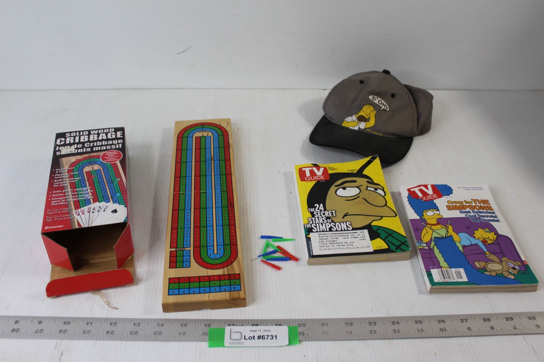 Solid Wood Cribbage Board - As Is, (2) Simpsons Books, Homer Hat