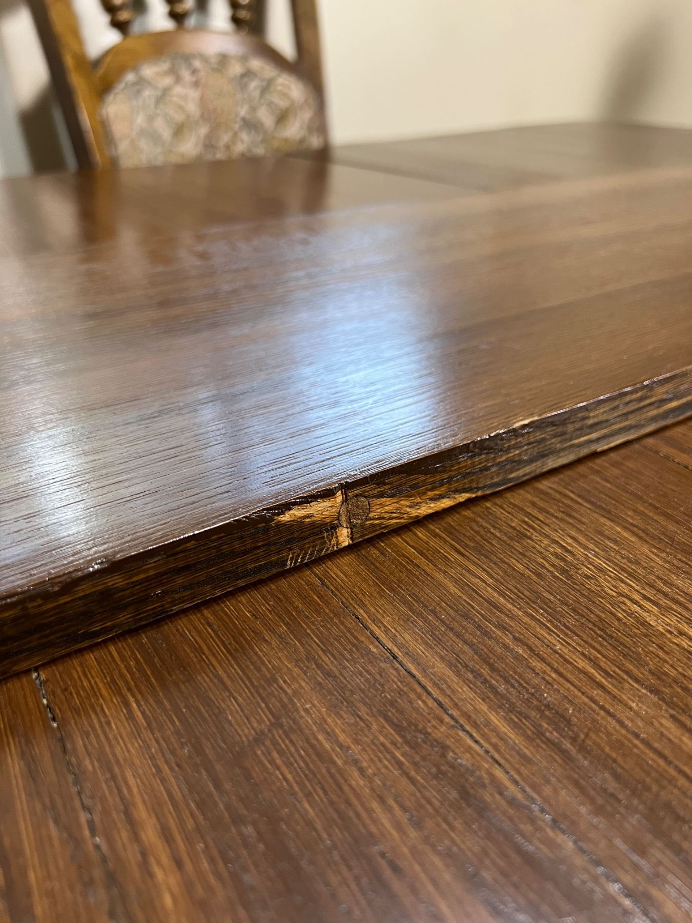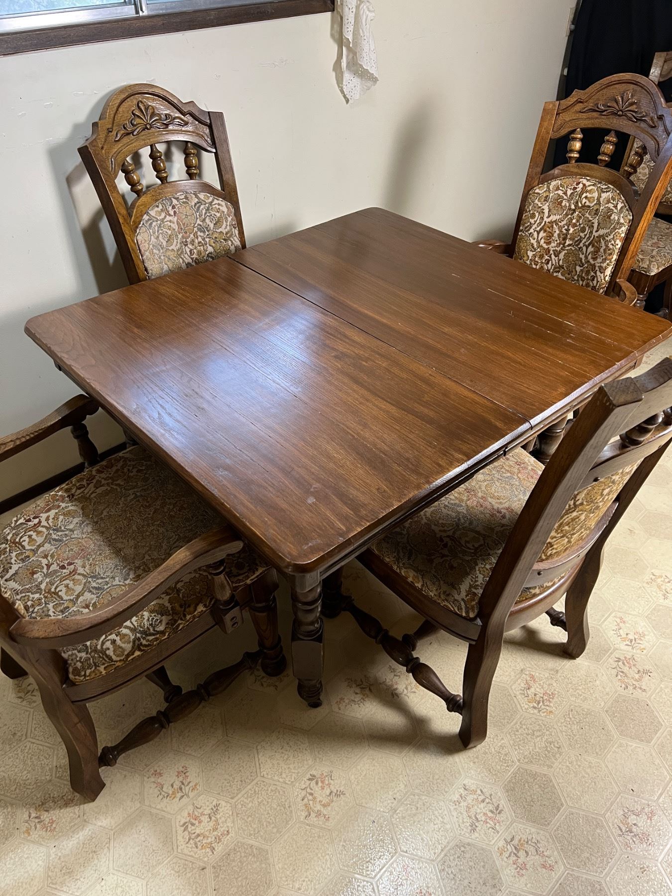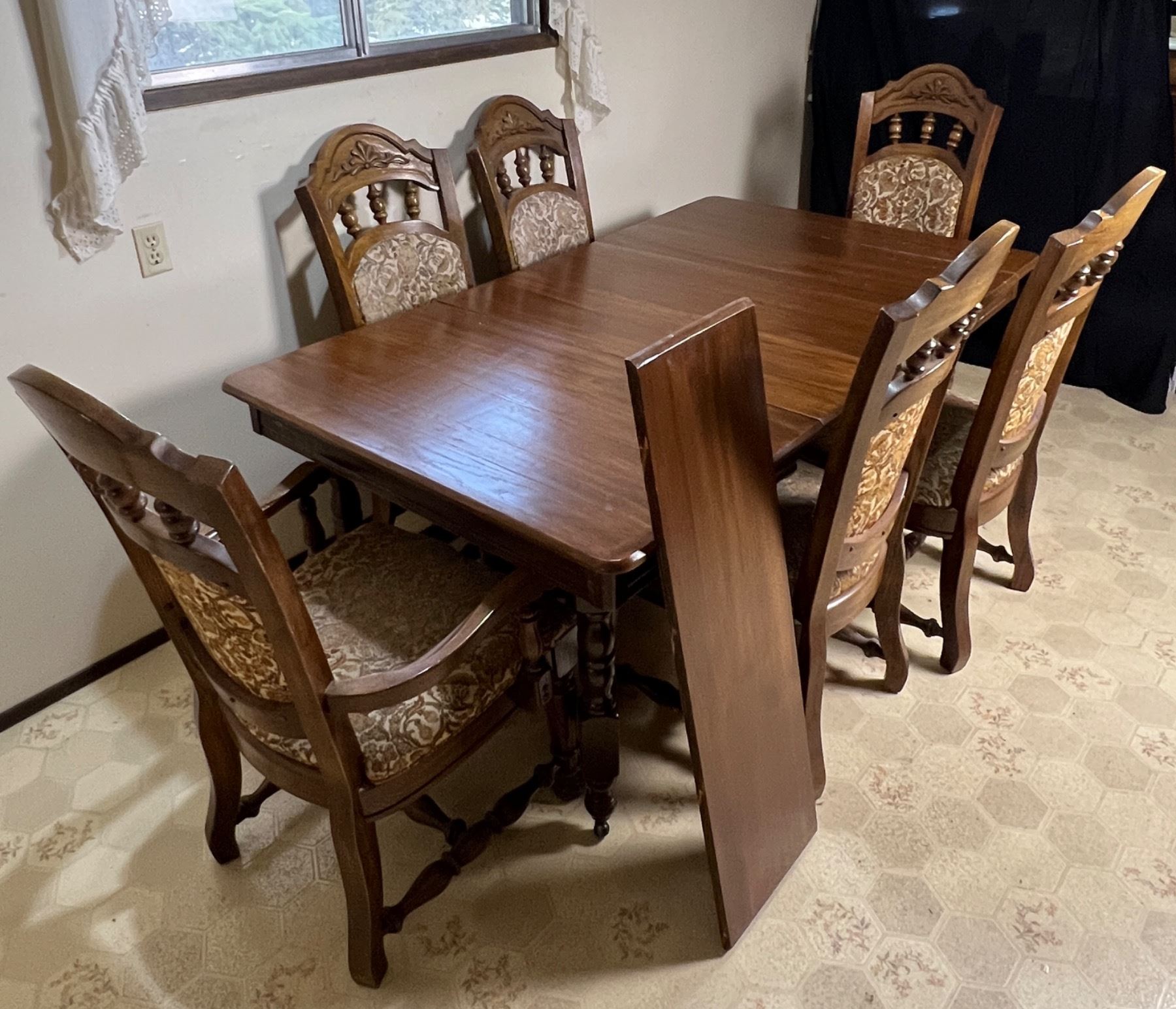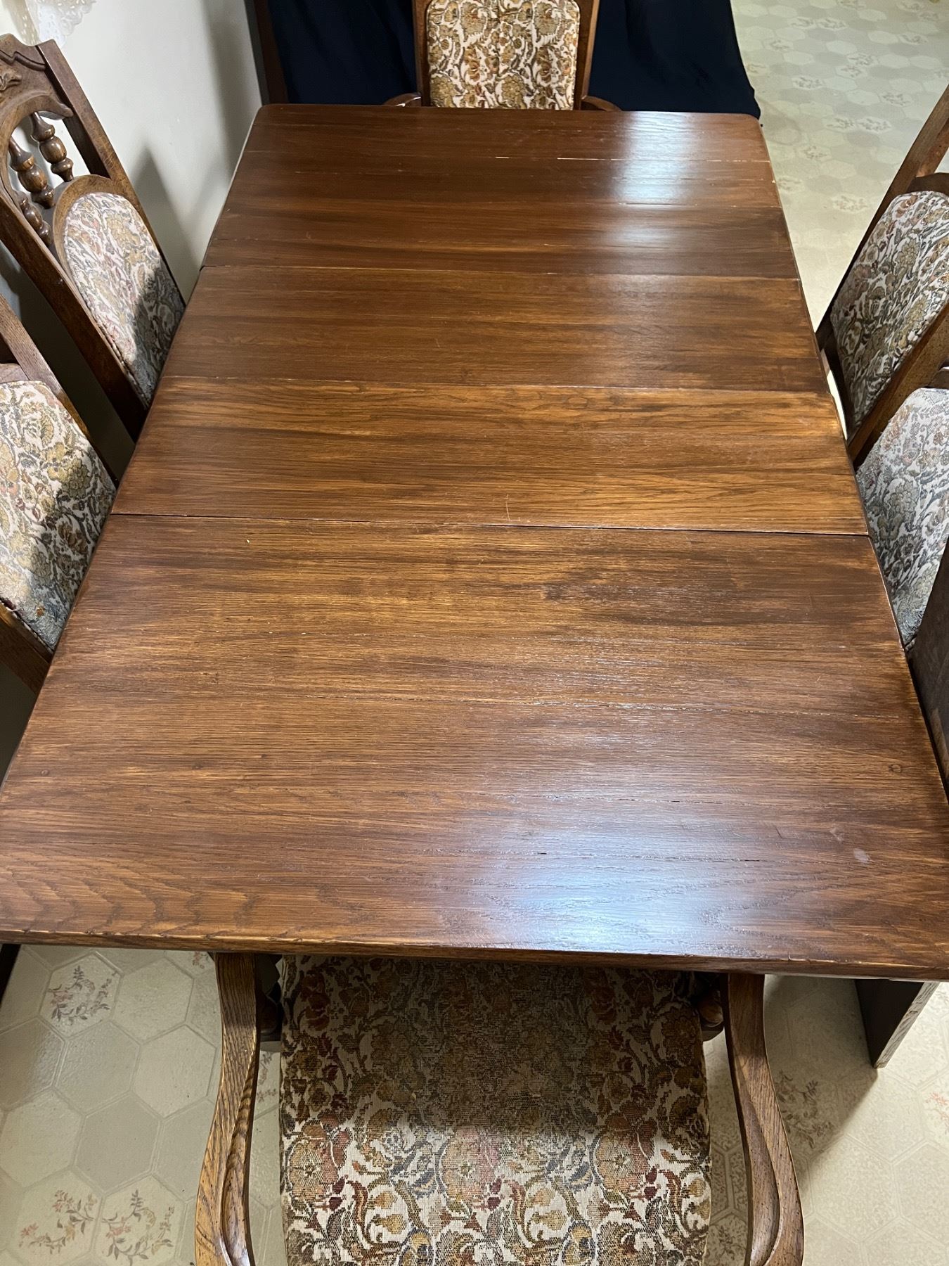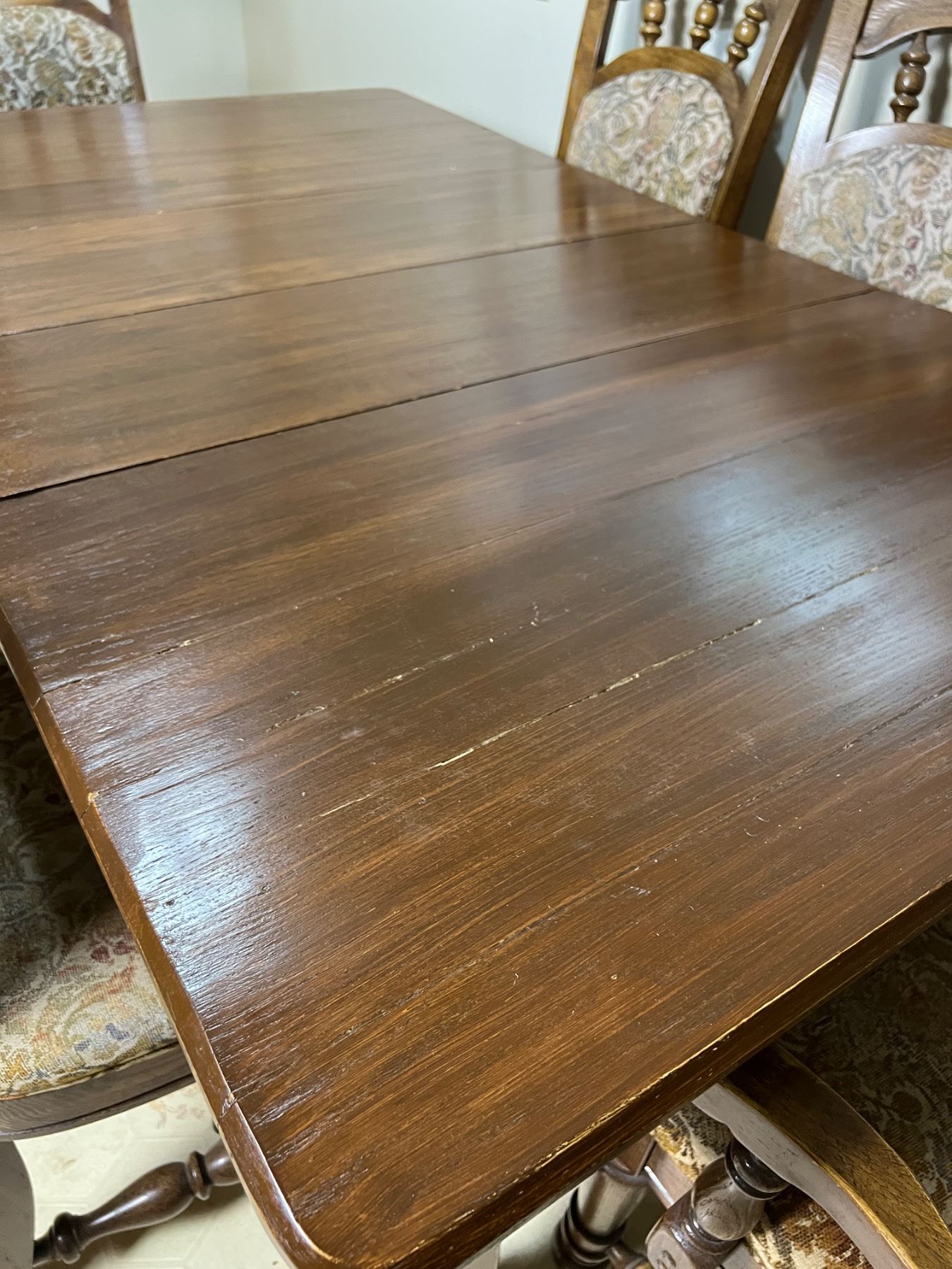 Please bring help to move, every piece is solid wood which means they weigh what solid wood dining tables and chairs weigh. Chairs are Singer Furniture, could not find markings on table. Without leafs table measures 48" by 42" and 31" tall. Each leaf is 12" wide and there is 3 for a total width of 84" inches. Chairs have seat height of 20". One of the leafs seems to have the dowels broken into the holes. Each chair has some form of damage to the upholstery.
