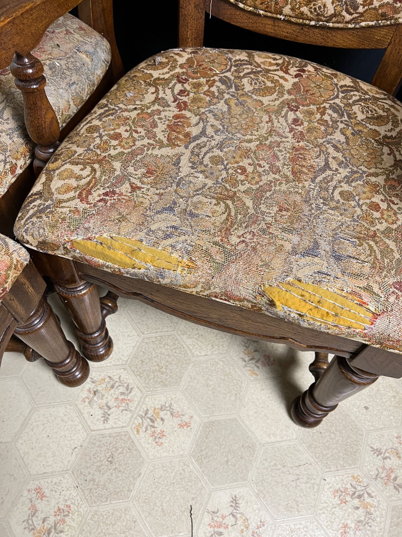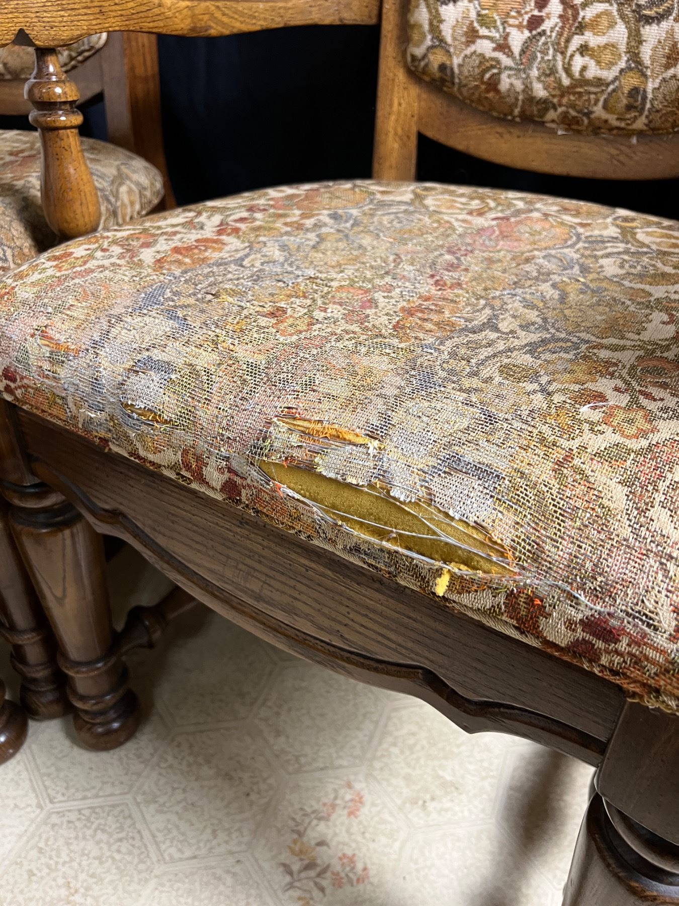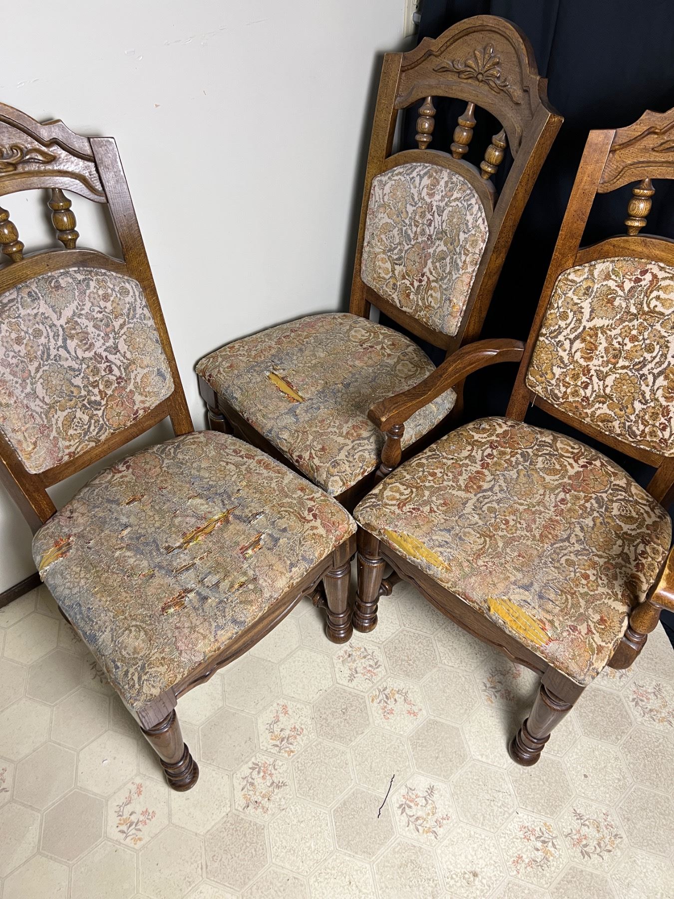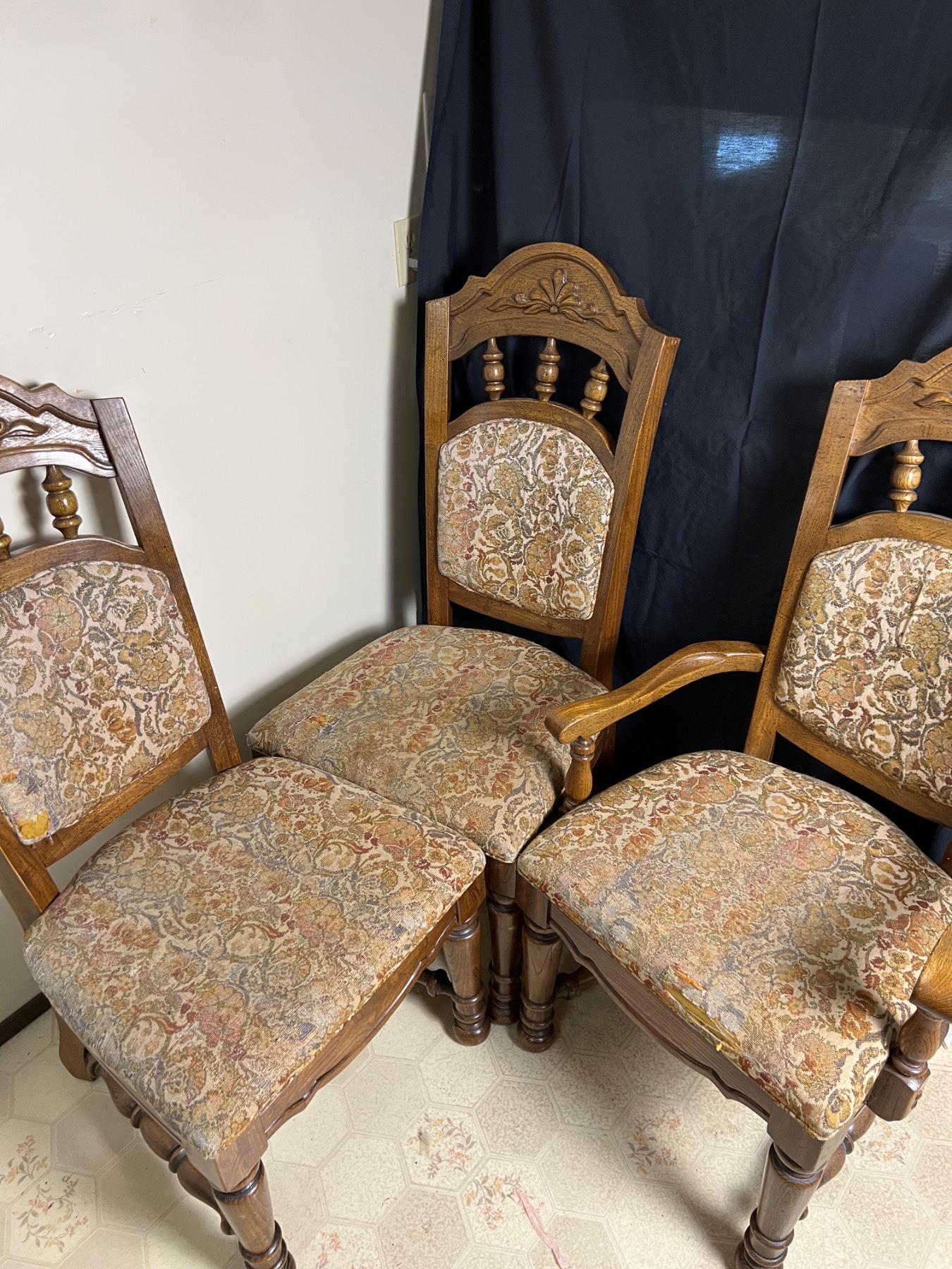 Please bring help to move, every piece is solid wood which means they weigh what solid wood dining tables and chairs weigh. Chairs are Singer Furniture, could not find markings on table. Without leafs table measures 48" by 42" and 31" tall. Each leaf is 12" wide and there is 3 for a total width of 84" inches. Chairs have seat height of 20". One of the leafs seems to have the dowels broken into the holes. Each chair has some form of damage to the upholstery.