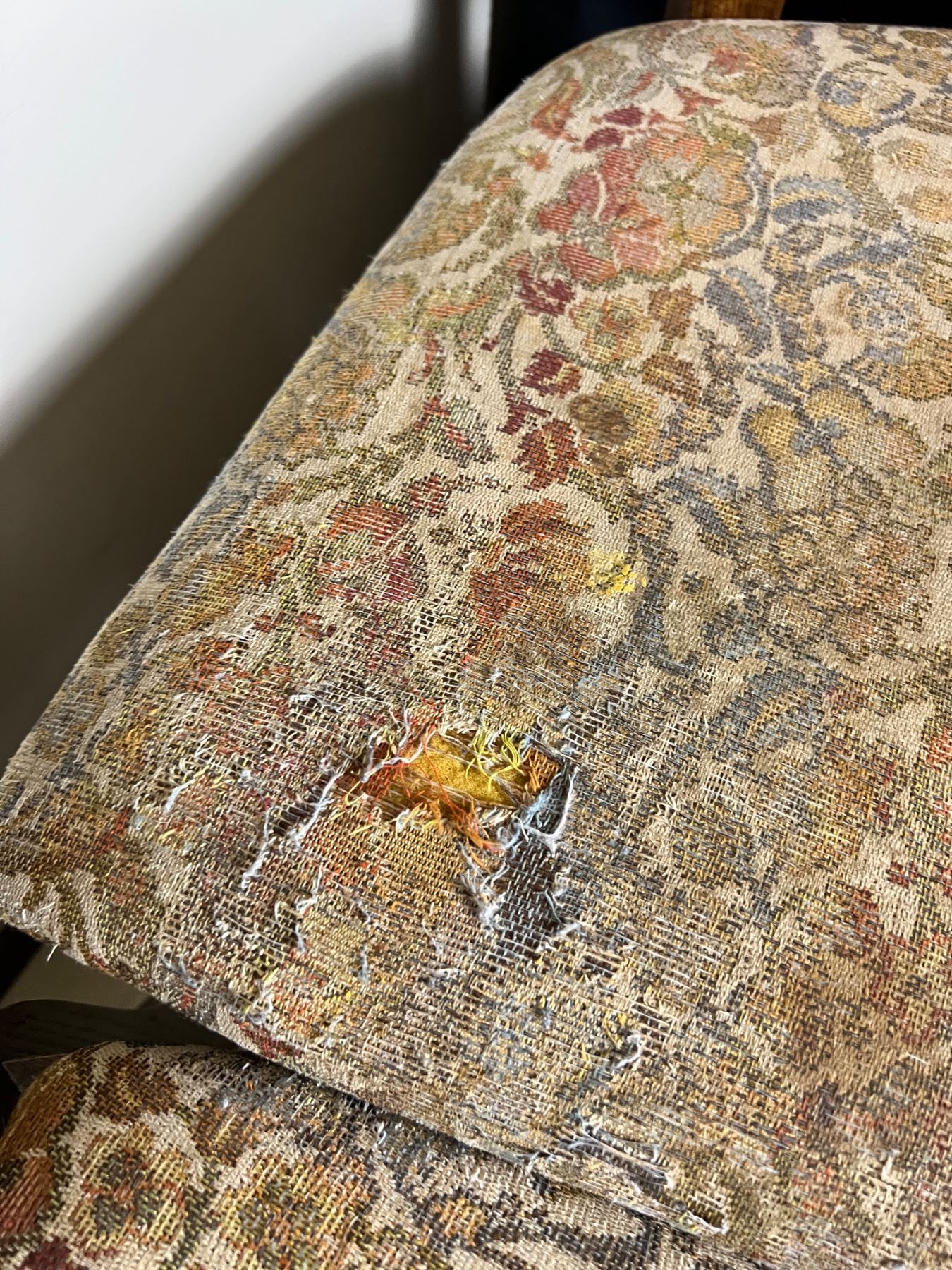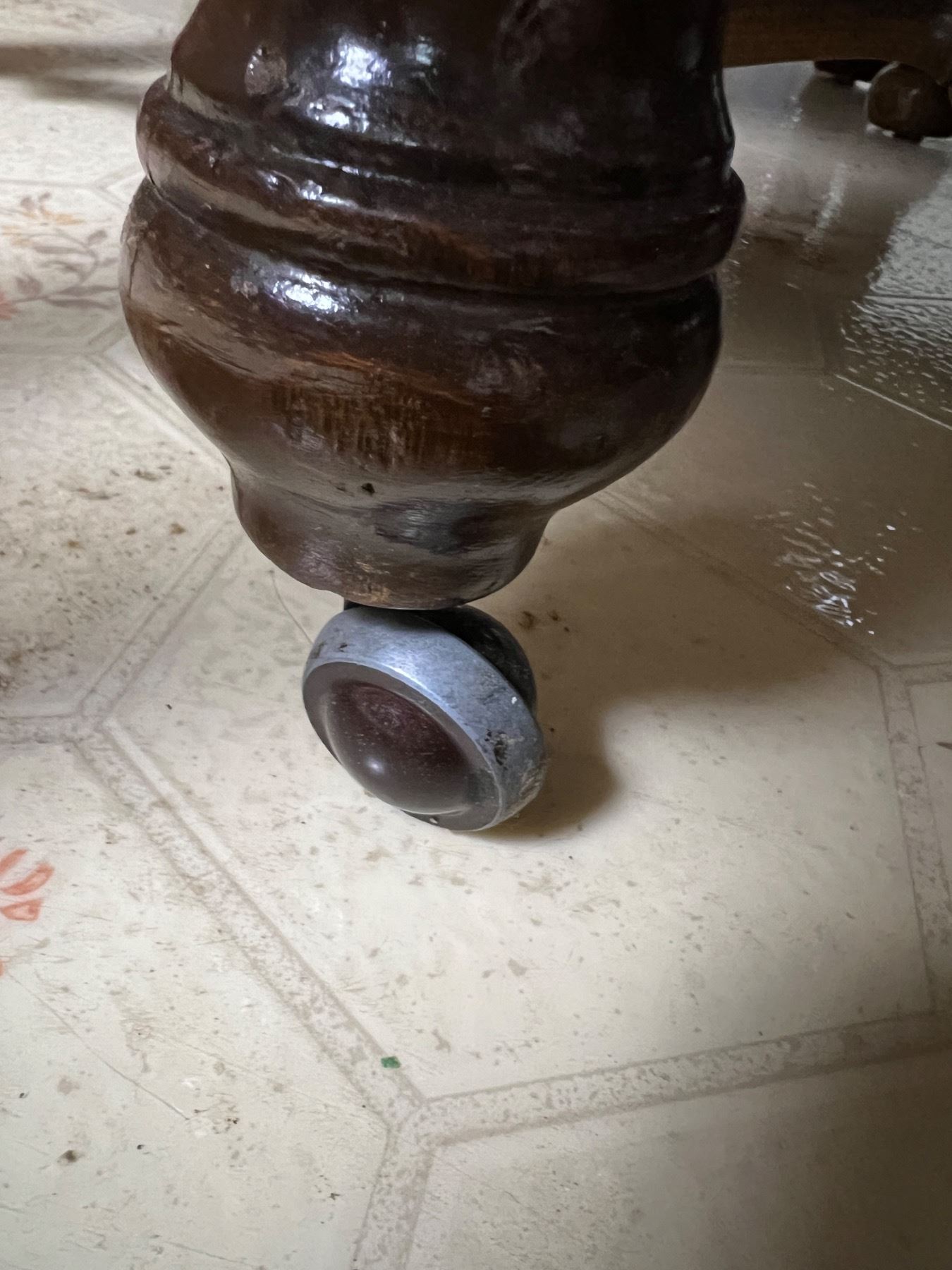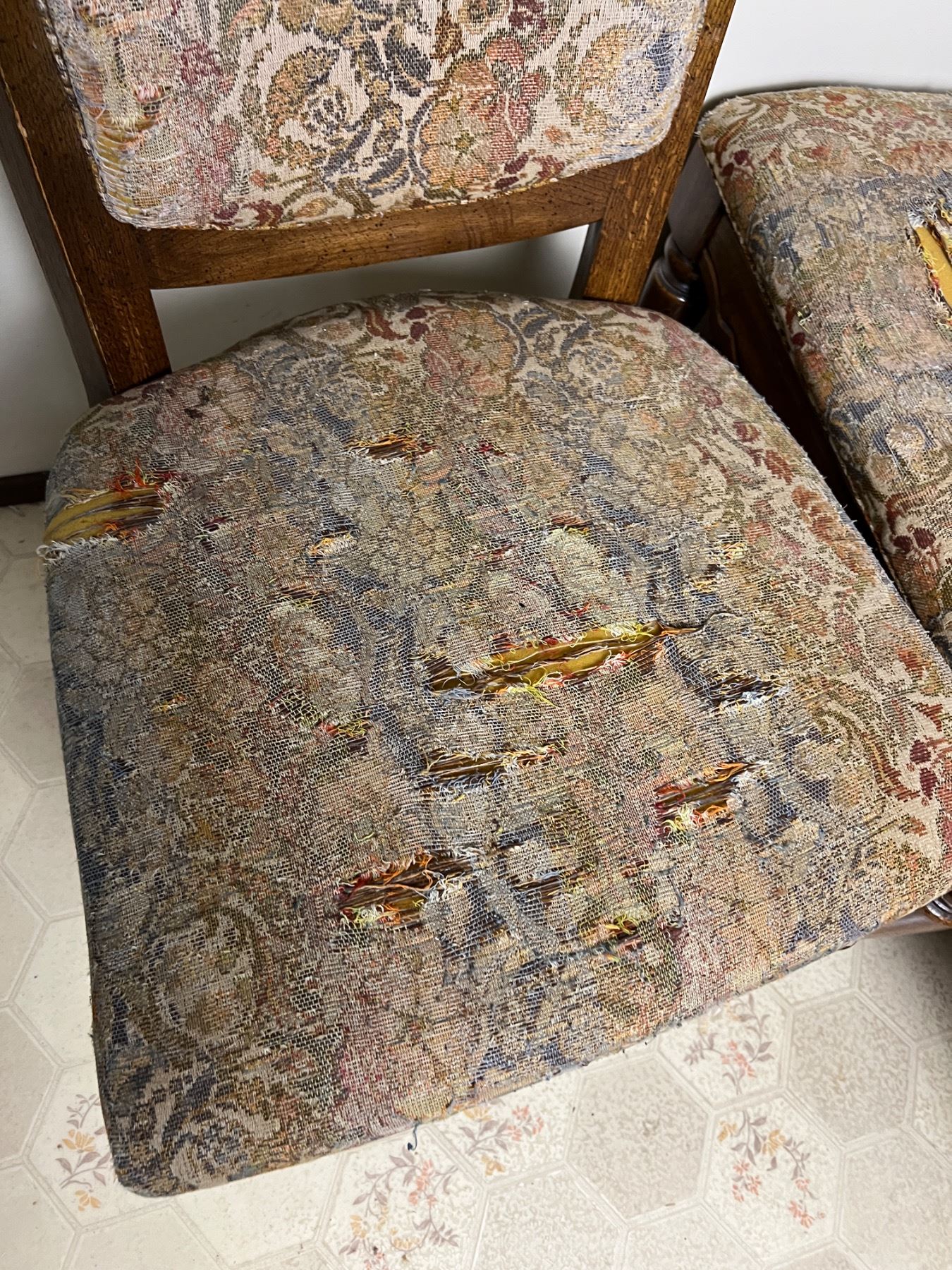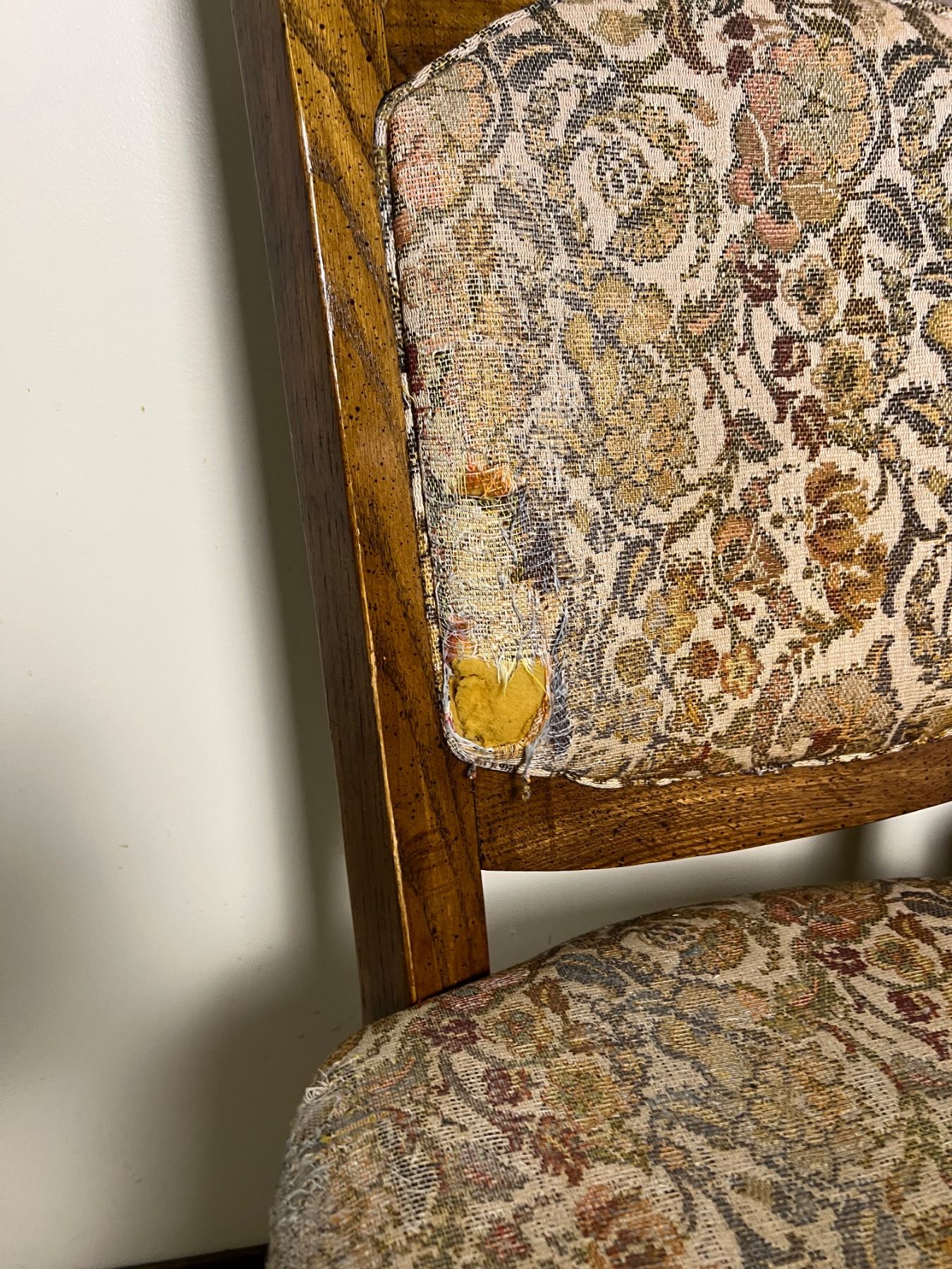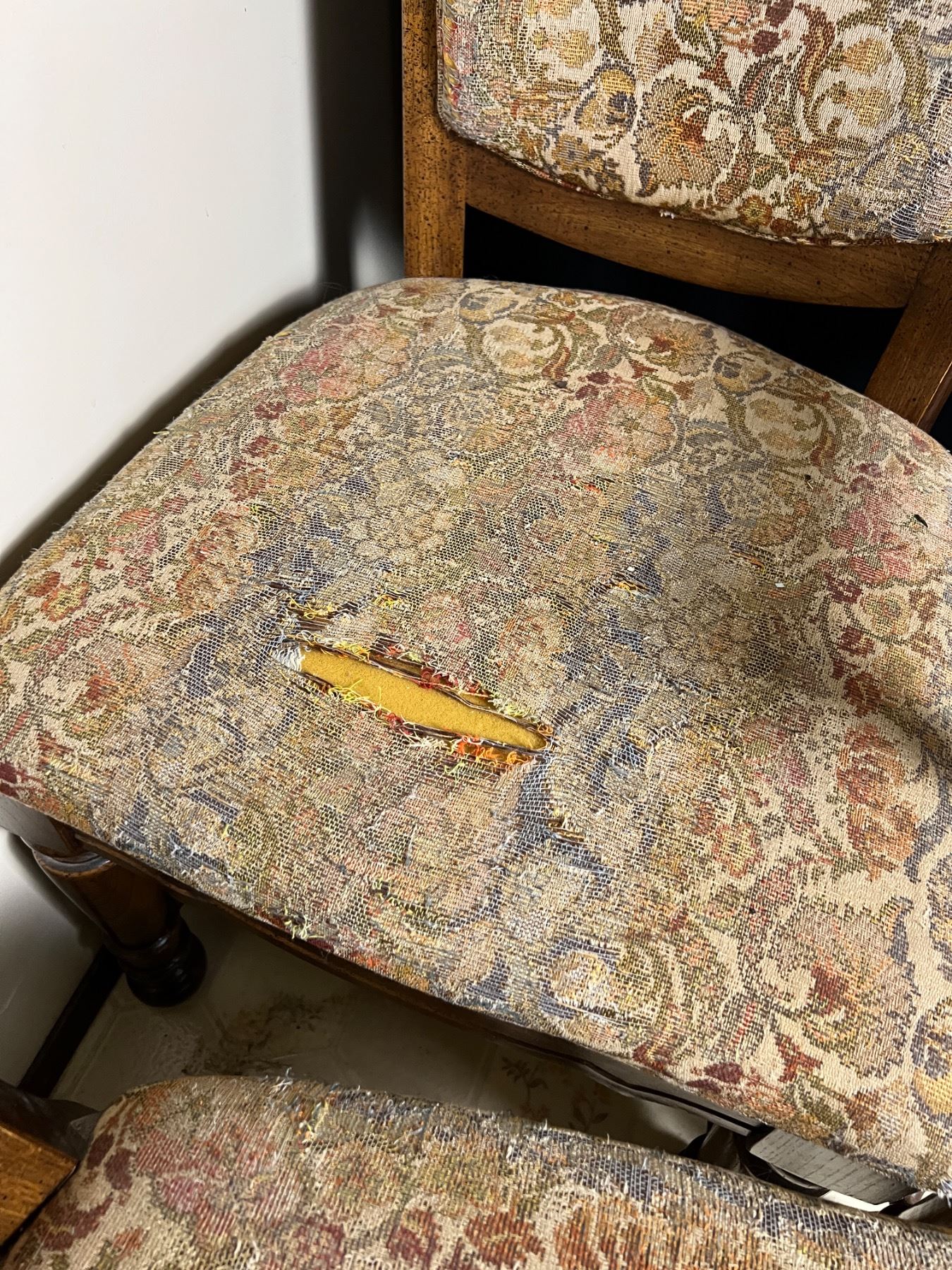 Please bring help to move, every piece is solid wood which means they weigh what solid wood dining tables and chairs weigh. Chairs are Singer Furniture, could not find markings on table. Without leafs table measures 48" by 42" and 31" tall. Each leaf is 12" wide and there is 3 for a total width of 84" inches. Chairs have seat height of 20". One of the leafs seems to have the dowels broken into the holes. Each chair has some form of damage to the upholstery.