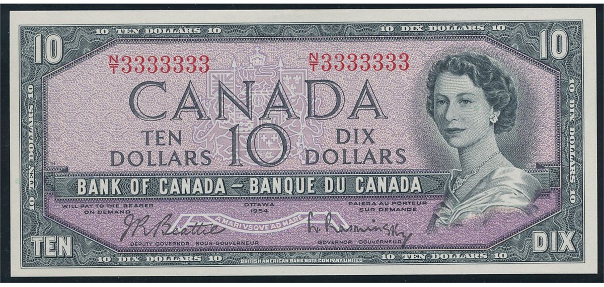Solid issue; 1954 $10 BC-40b #NT3333333, PMG Gem UNC65EPQ.