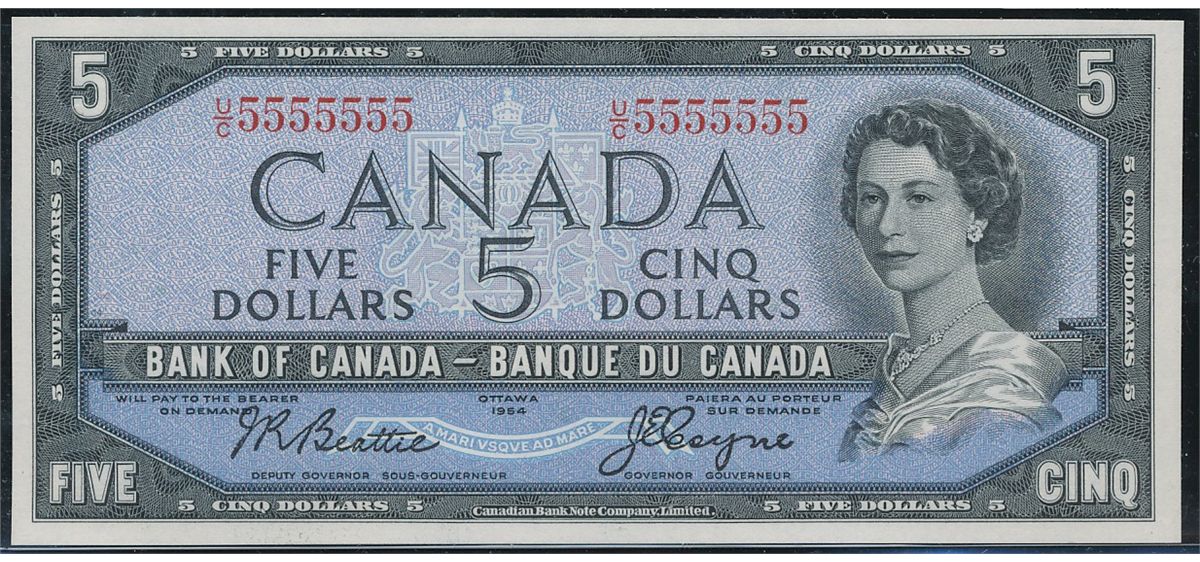 Solid issue; 1954 $5 BC-39a #UC5555555. Nice AU/UNC issue.