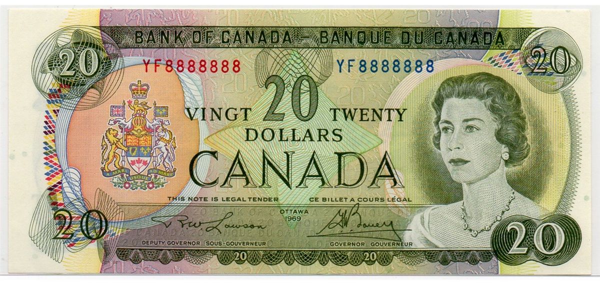 Solid issue; 1969 $20 BC-50b #YF8888888, CCCS CH UNC63.