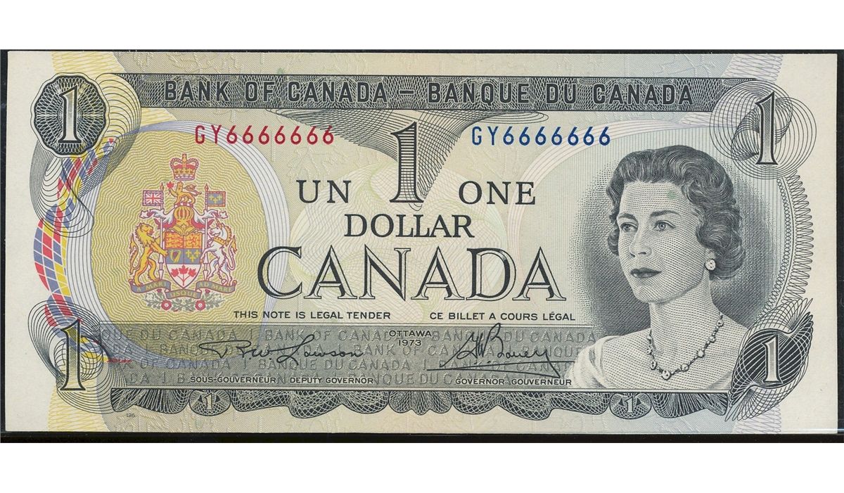 Solid issue; 1973 $1 BC-46a #GY6666666, PMG Gem UNC66EPQ.