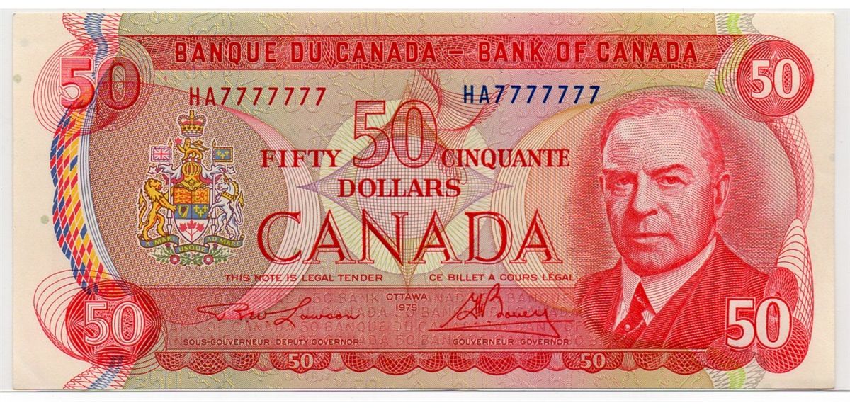 Solid issue; 1975 $50 BC-51a #HA7777777, CCCS AU58.