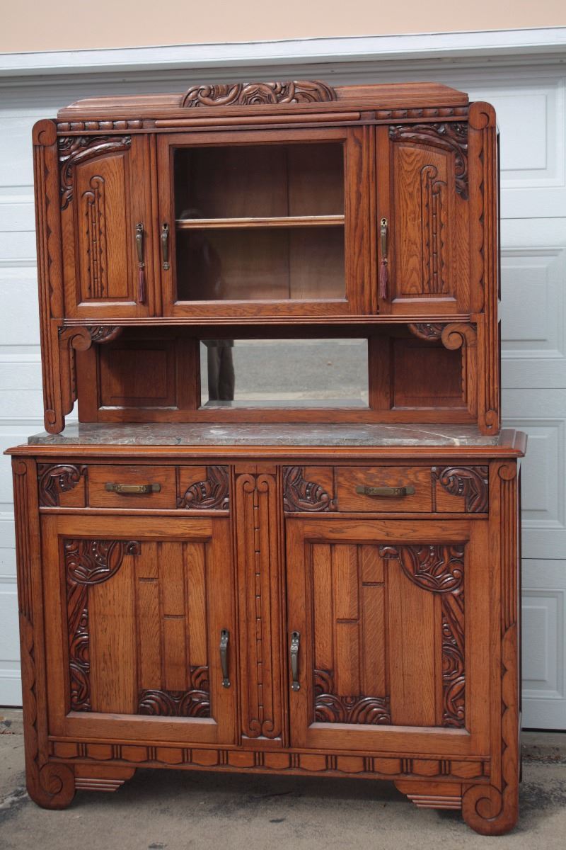 This is an early 1900's solid oak hutch with a marble top- heavily carved and very ornate