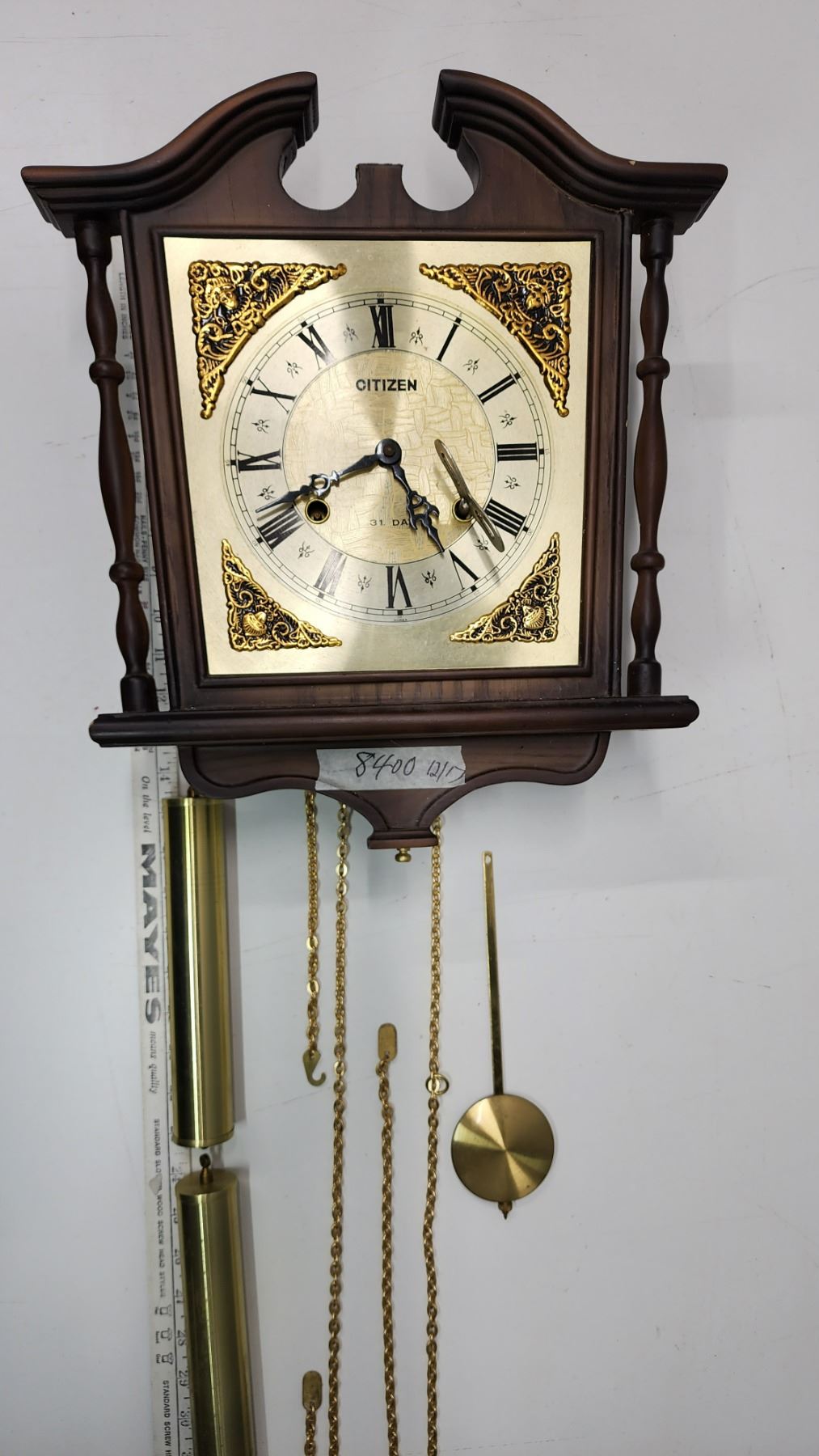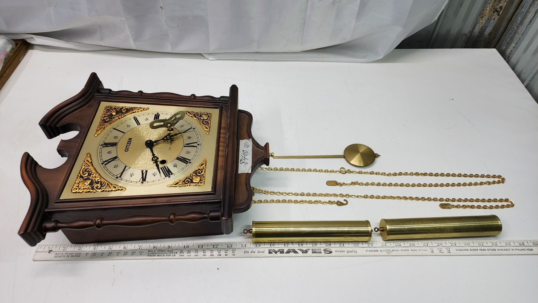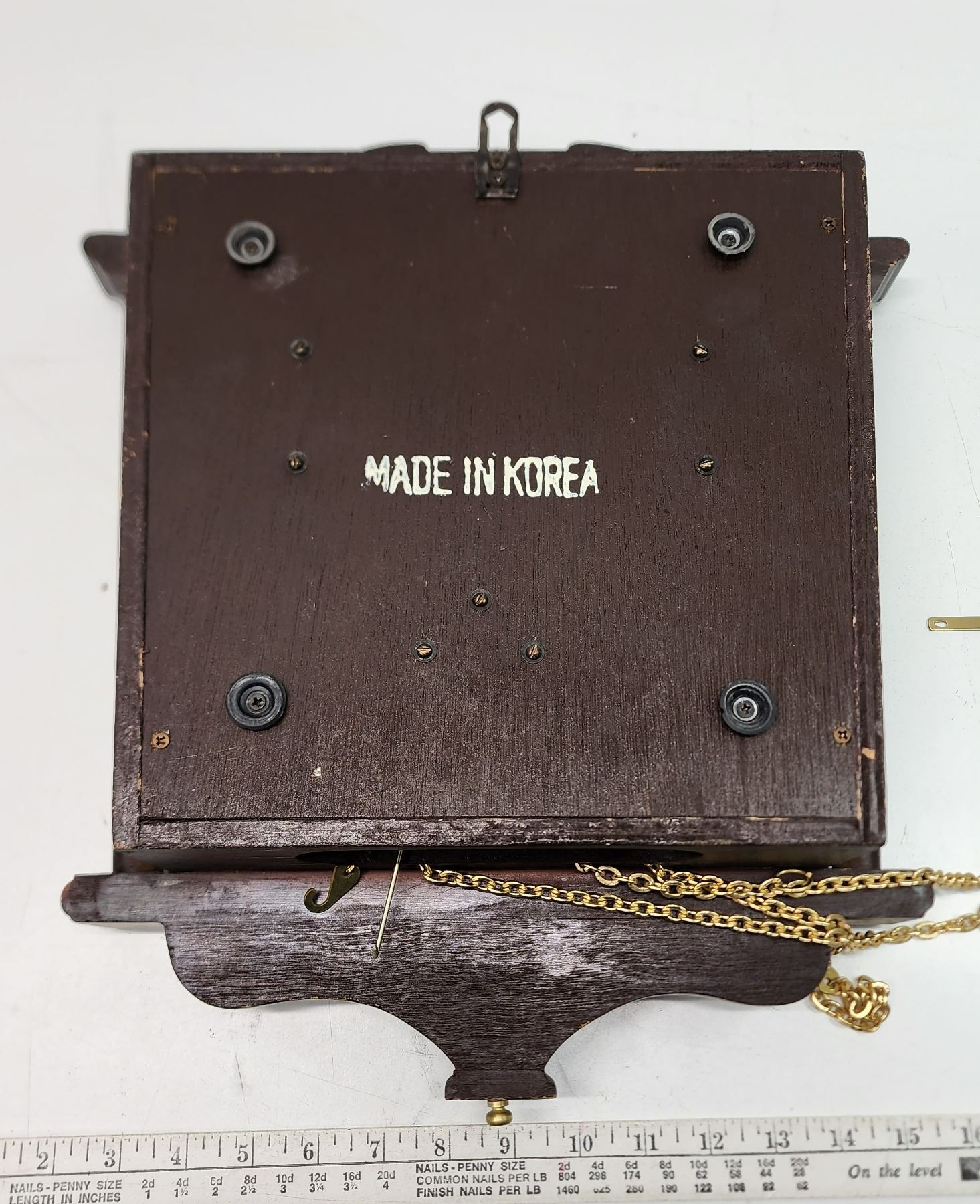 Solid wood, Vintage wall hanging clock - with weights, pendulum and key - 15"W x 17"H x 5"D
