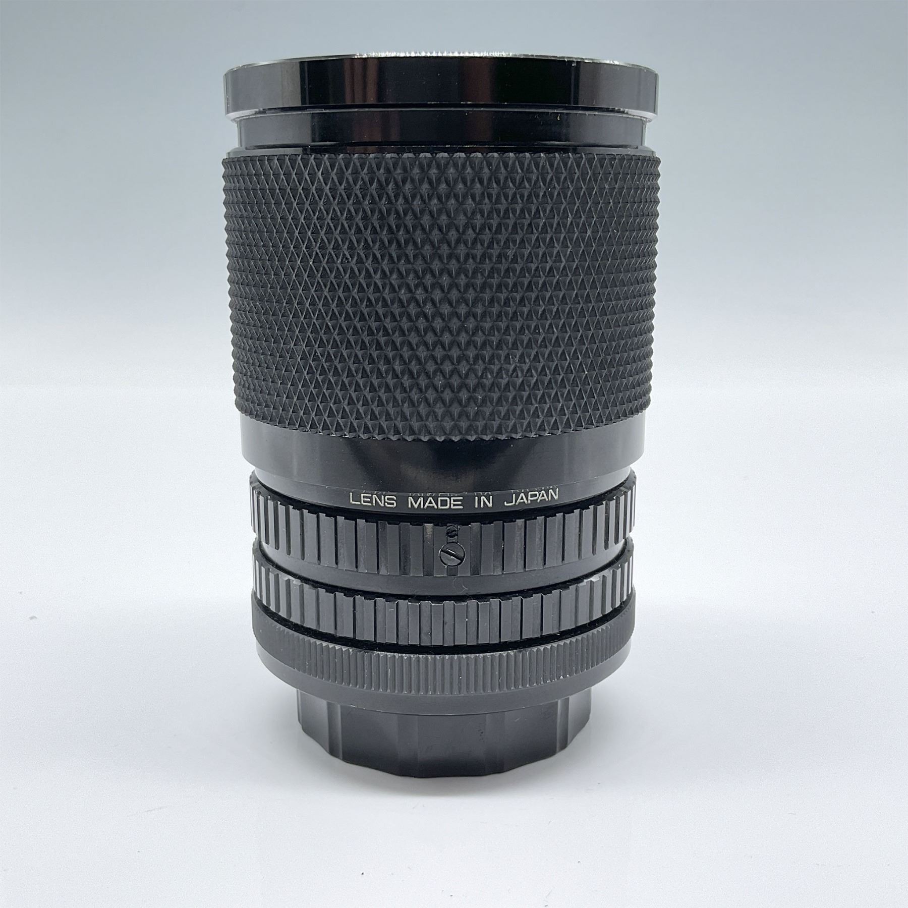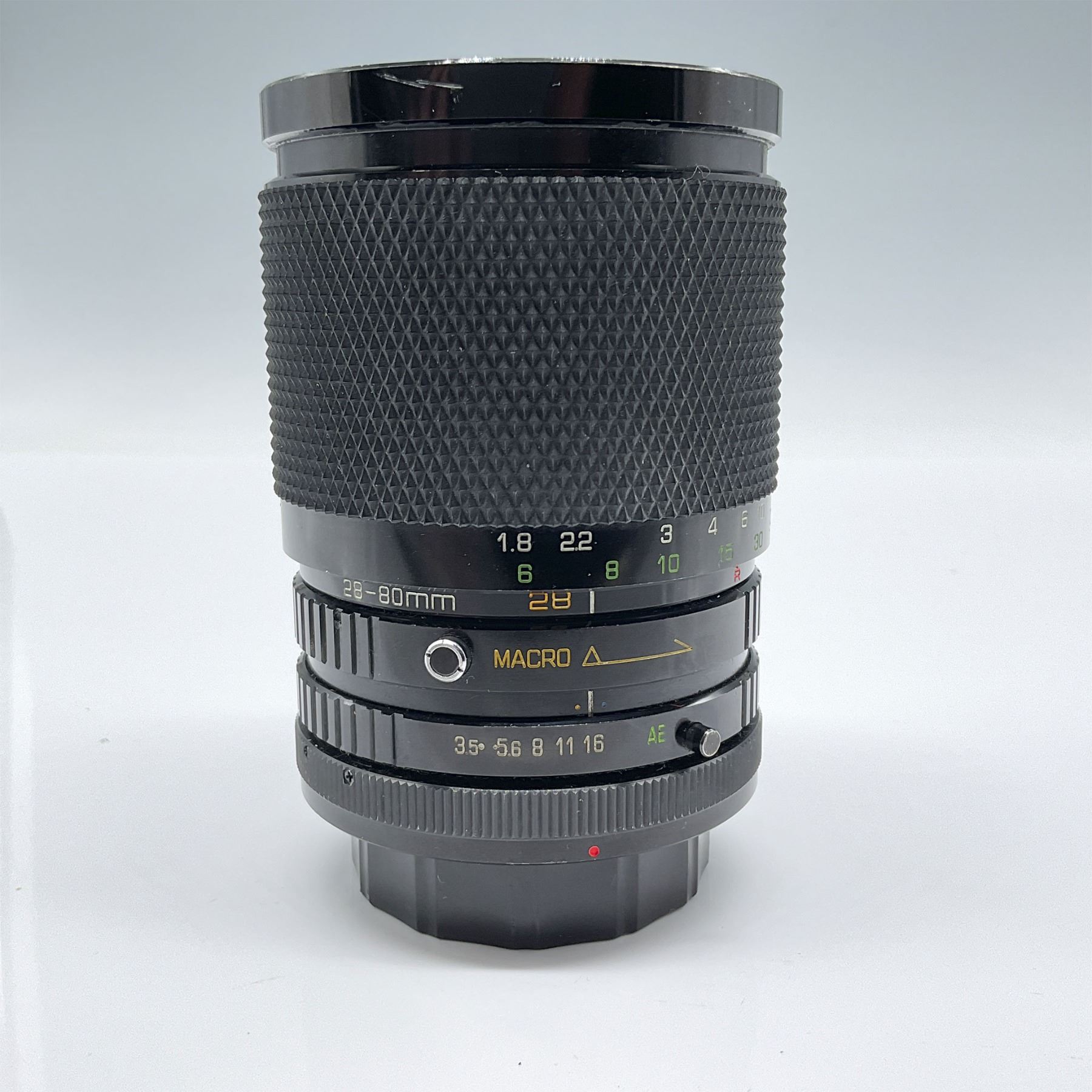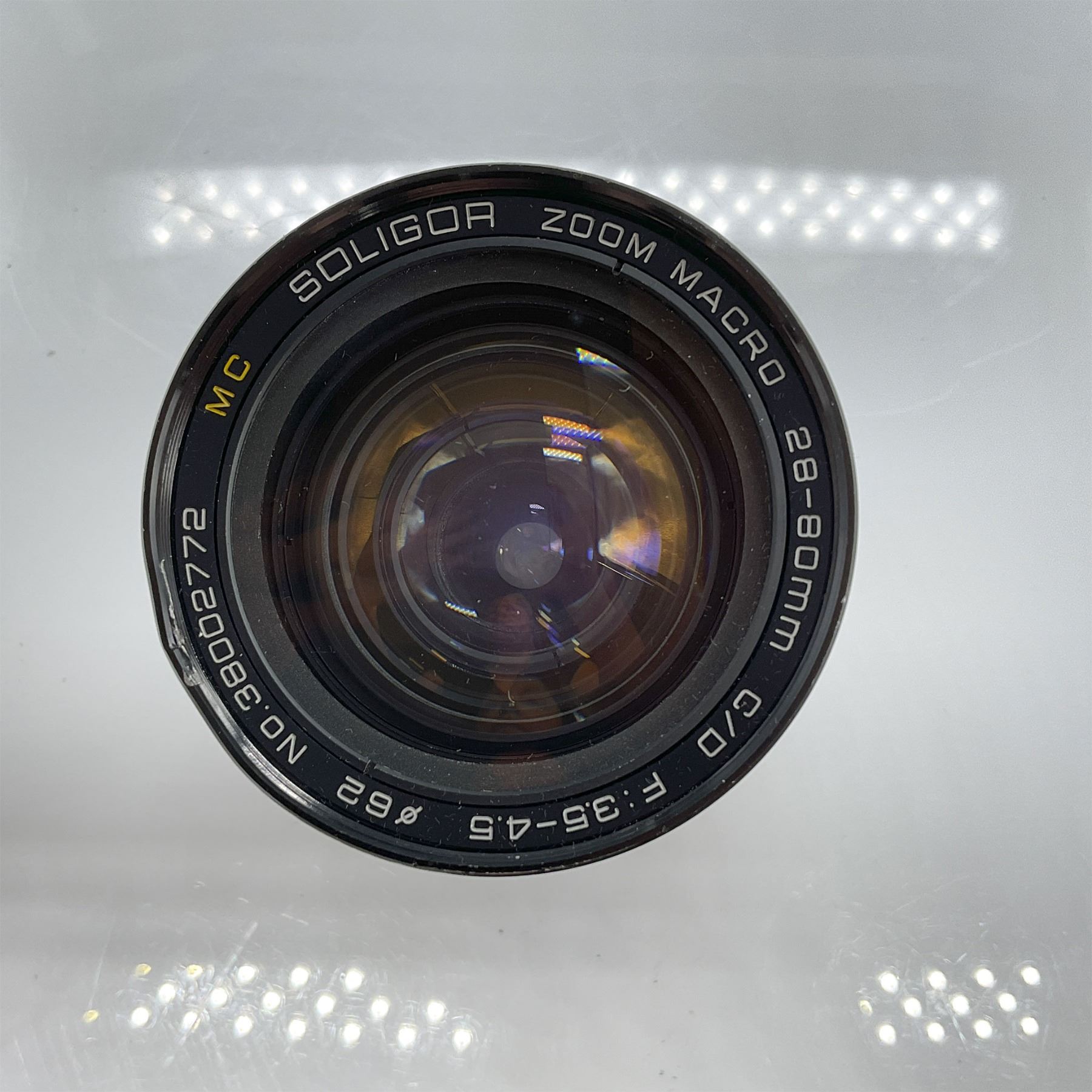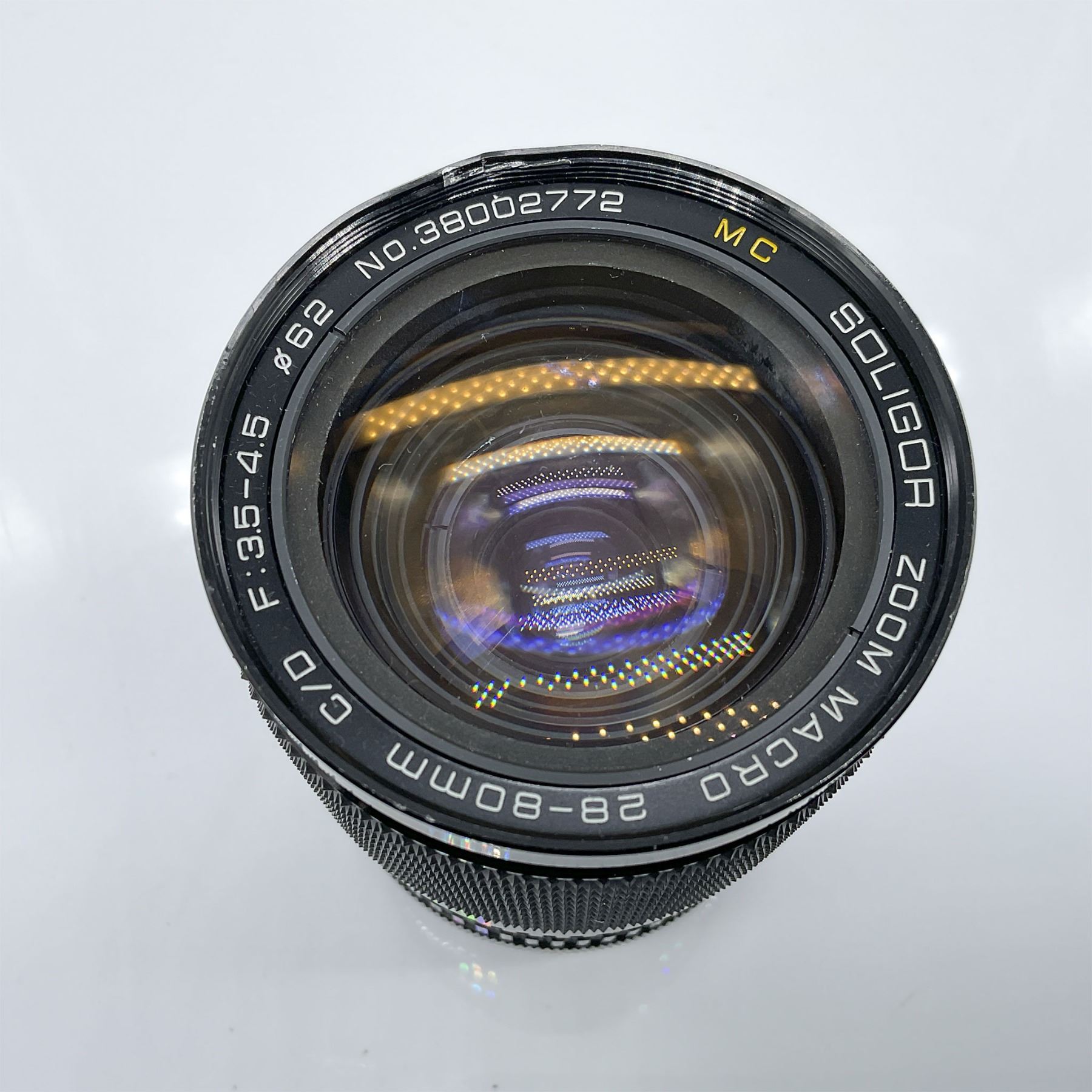 Soligor 28-80mm macro zoom lens, featuring a focal length range of 28-80mm and an aperture of f/3.5-4.5. This manual focus lens includes a multicoated (MC) optic for enhanced image quality and reduced flare. Serial No. 38002772, designed with a 62mm filter thread. Measures approximately 4.25"H when extended. The lot includes one lens cap. A versatile and collectible piece for vintage photography enthusiasts.