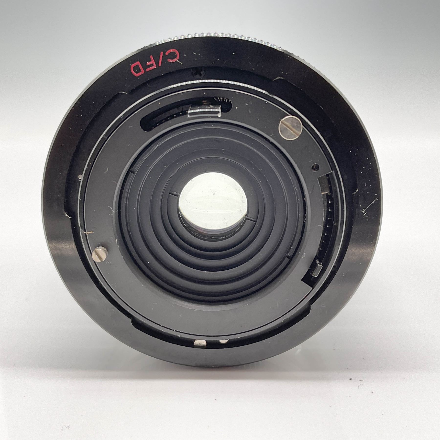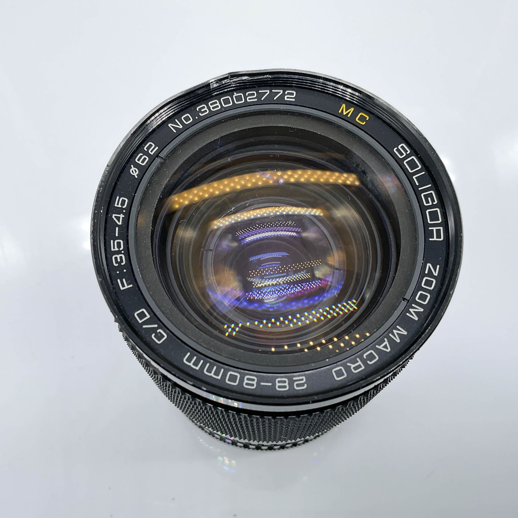 Soligor 28-80mm macro zoom lens, featuring a focal length range of 28-80mm and an aperture of f/3.5-4.5. This manual focus lens includes a multicoated (MC) optic for enhanced image quality and reduced flare. Serial No. 38002772, designed with a 62mm filter thread. Measures approximately 4.25"H when extended. The lot includes one lens cap. A versatile and collectible piece for vintage photography enthusiasts. Can be usable with modern cameras with adaptor. Mount type : Canon FD