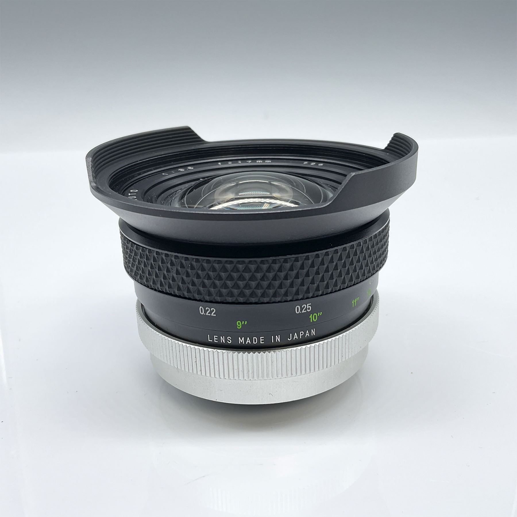 Vintage Soligor Wide-Auto 1:3.5 f=17mm lens, measuring 2.75"H. This precision lens features manual settings and comes complete with its original black leather zippered case lined in red velvet, as well as its protective front cap marked "Soligor." Soligor lenses are well-regarded for their build quality and optical performance, making this an excellent addition for collectors or photographers. Serial No. 17500827 is etched on the lens body.