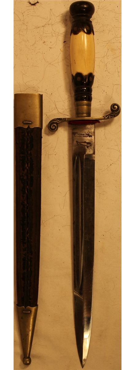 Solingen Bone Handled Dagger with Sheath; spearpoint dagger with ornate hilt, complete with belt clip sheath. Measuring 14" in total length.