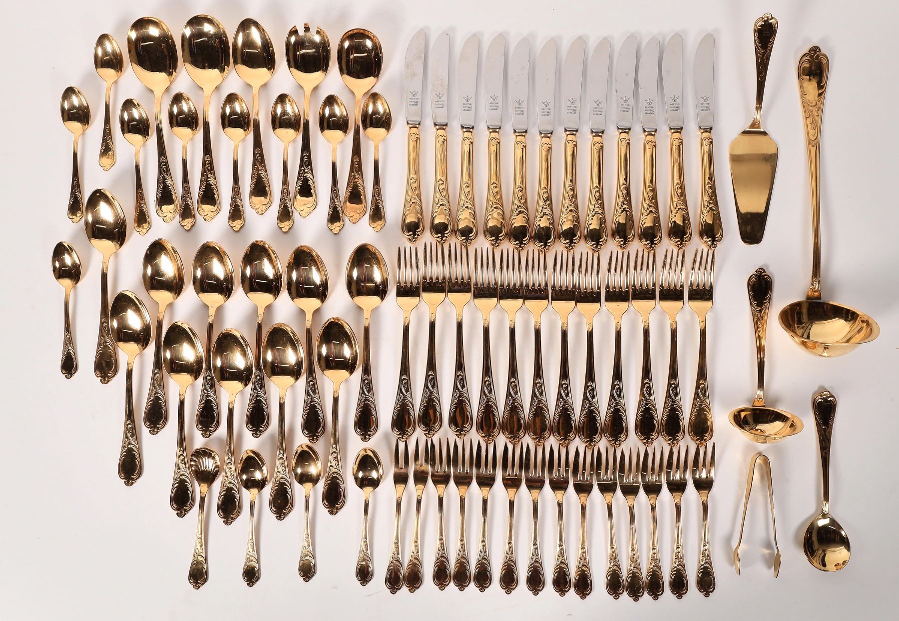 This tableware is marked "Solingen." The mark "18/10" refers to 18 Chromium and 10 nickel steel. "23/24K Gold Plate" refers to double hardness of normal fine gold by the use of a cobalt additive. Included is guarantee No. 18026. The set includes: one ladle; one soup spoon; one cake server; one sugar tong; five serving spoons; one jelly spoon; two cake forks; 12 salad forks; 12 dinner forks; 12 spoons; 12 tablespoons; 12 table knives.