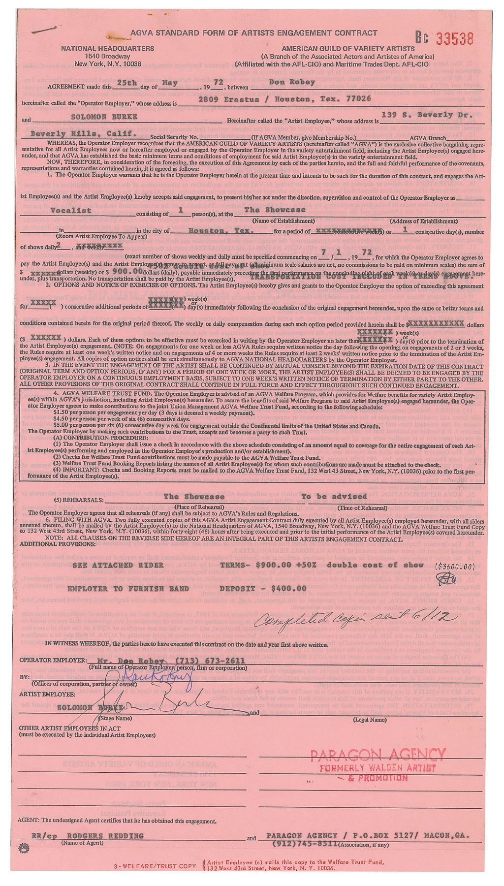 American preacher and singer (1940–2010) who shaped the sound of rhythm and blues as one of the founding fathers of soul music in the 1960s; he is best known for the songs 'Cry to Me,' 'If You Need Me,' 'Got to Get You Off My Mind,' 'Down in the Valley,' and 'Everybody Needs Somebody to Love.' Scarce DS, one page, 9.25 x 17, May 25, 1972. AGVA contract concerning an agreement between Don Robey and Solomon Burke, in which the latter agrees to perform two shows at The Showcase in Houston, Texas, on July 1, 1972. Signed at the conclusion in black ballpoint by Burke, who also signs on the attached rider. In fine condition.