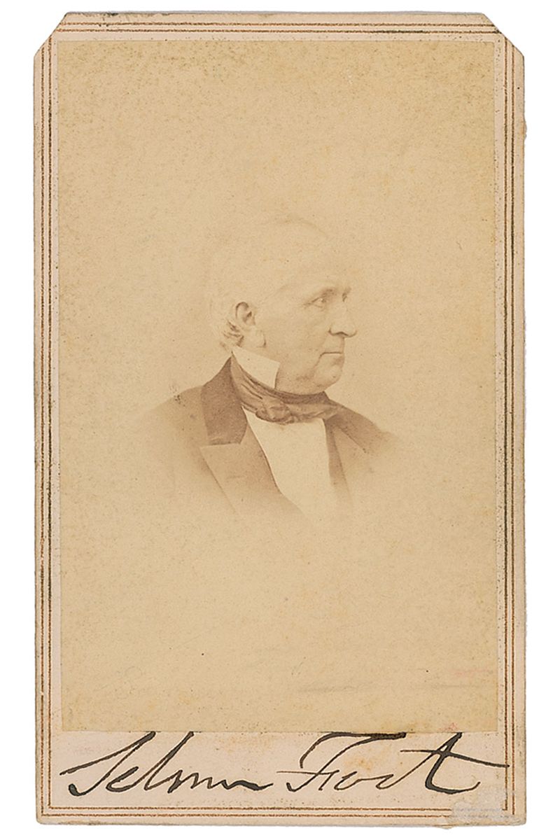 Politician from Vermont (1802–1866) who served as senator for over 25 years. Original 2.25 x 4 carte-de-visite portrait of Foot in profile, signed in the lower border in black ink. Clipped upper corners and mounting remnants to reverse, otherwise fine condition.