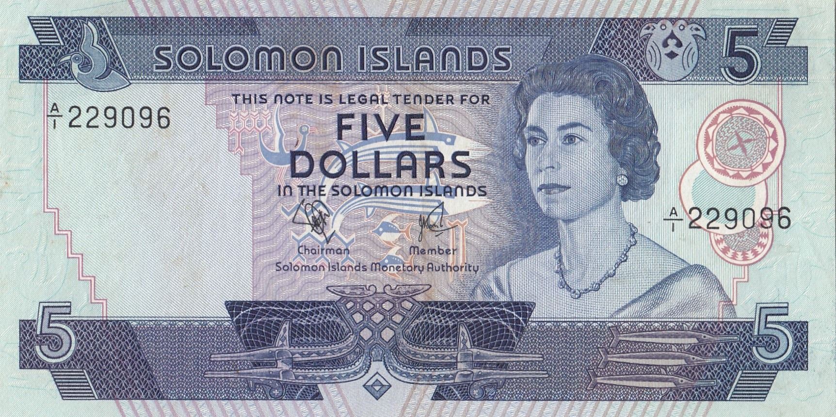 Solomon Islands, 5 Dollars, 1977, XF, p6abr/Queen Elizabeth II portrait, serial number:A/1 229026