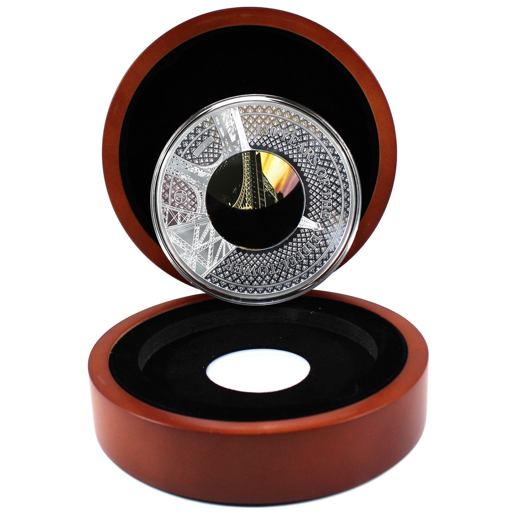 Solomon Islands Issue: 2019 $10 Translucent Treasures - 130 Years of the Eiffel Tower 5oz Coloured Fine Silver Coin with Glass Inlay in Beautiful Deluxe Display Case (Light toning spots on obverse of coin). Low mintage of only 500!!! (TAX Exempt)