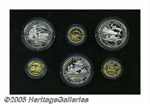 <B>Republic Proof Set 1991-1992, </B></I>The World War II Commemorative Coin Collection, unlisted in KM as a set, featuring three Silver One Dollar coins, KM30a, 35a and 41a, and three Gold 25 Dollars, KM32, 37 and 43. All Gem Proof in the case of issue with the certificate of authenticity.