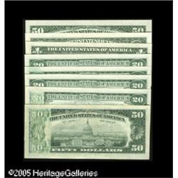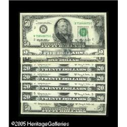 <B>Solvent Smear Grouping.</B></I> A <B>Choice New 1993 $50</B></I> with a major smear across the right side of the face. A <B>Gem New 1995 $5</B></I> with a severe smear nearly washing away Lincoln. An <B>XF 1988 $1</B></I> with a minor smear at the left end. An <B>XF 1963A $50</B></I> with a severe smear on the left one inch of the back. And a group of four <B>Gem New 1963A $20s</B></I>: two perfect bookend notes, a minor smear at the left edge of the back, and a major smear at the left edge of the back. 8 notes Lot:15340