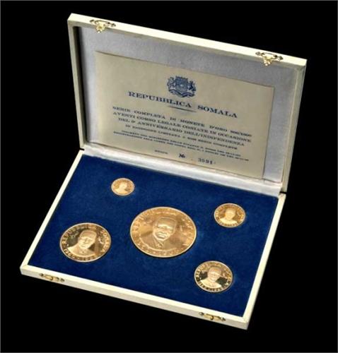 Somalia - Repubblica - Serie completa 1965 in cofanetto commemorativa del 5° anniversario dell'indipendenza La serie comprende 5 valori (500, 200, 100, 50 e 20 Scellini) per un totale in peso di 122,5 gr. di oro 900 - N. 3091 di 8000 coniate - Cofanetto in condizioni non perfette