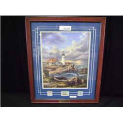 Framed Collector's Print of Lighthouse by Reichardt w/ (3) Collector's Stamps "Portland Head"