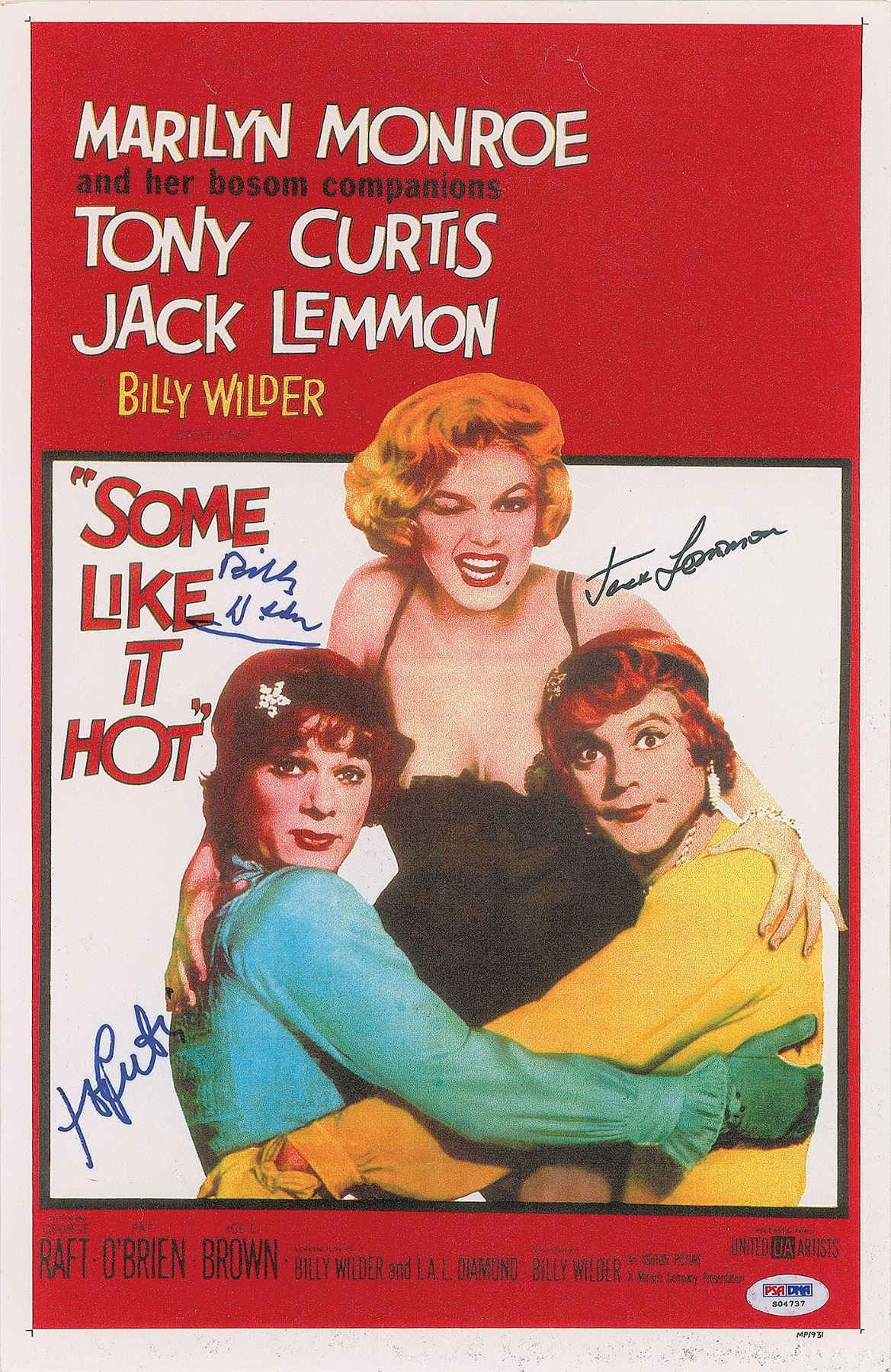 Color 11 x 17 print of the poster for the 1959 film Some Like It Hot, signed in blue felt tip by Tony Curtis and Billy Wilder, and in black felt tip by Jack Lemmon. In fine condition. Accompanied by a full letter of authenticity from PSA/DNA.