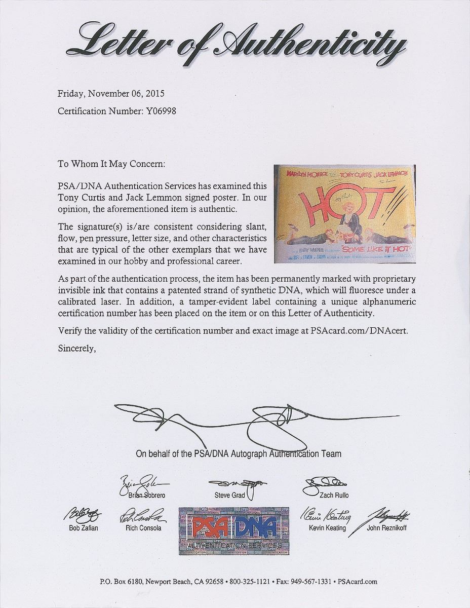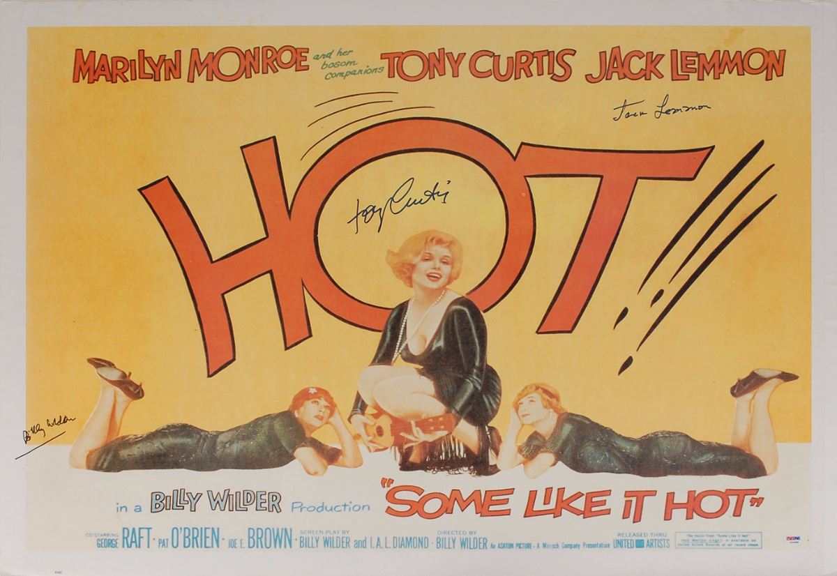 Appealing color 37.75 x 26 poster of the 1959 classic Some Like It Hot, signed in black and blue felt tip by Jack Lemmon, Tony Curtis, and Billy Wilder. Rolled and in fine condition. Accompanied by a full letter of authenticity from PSA/DNA.