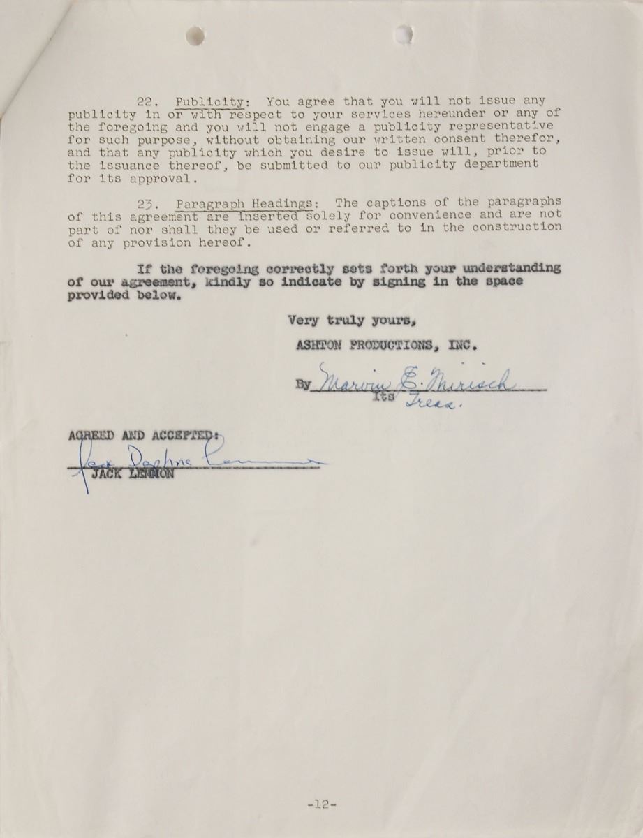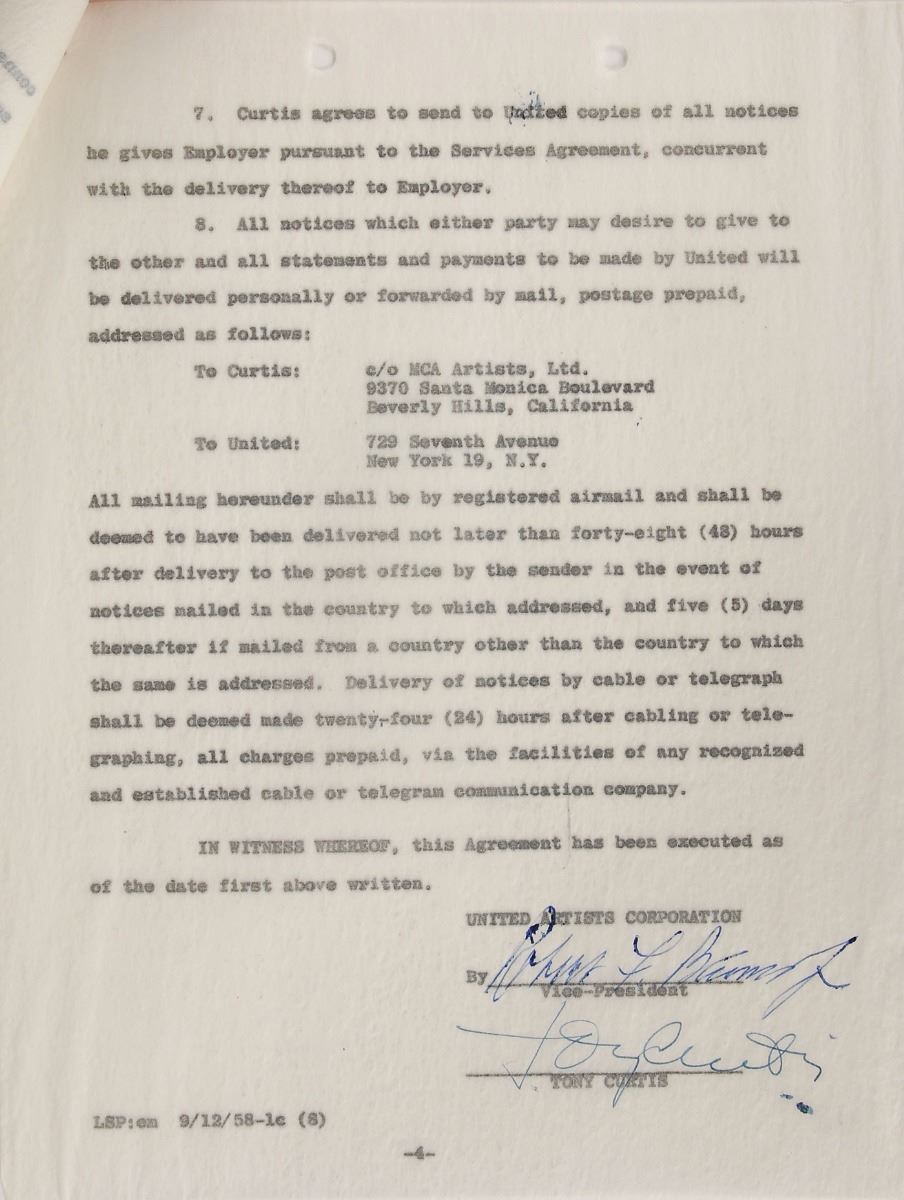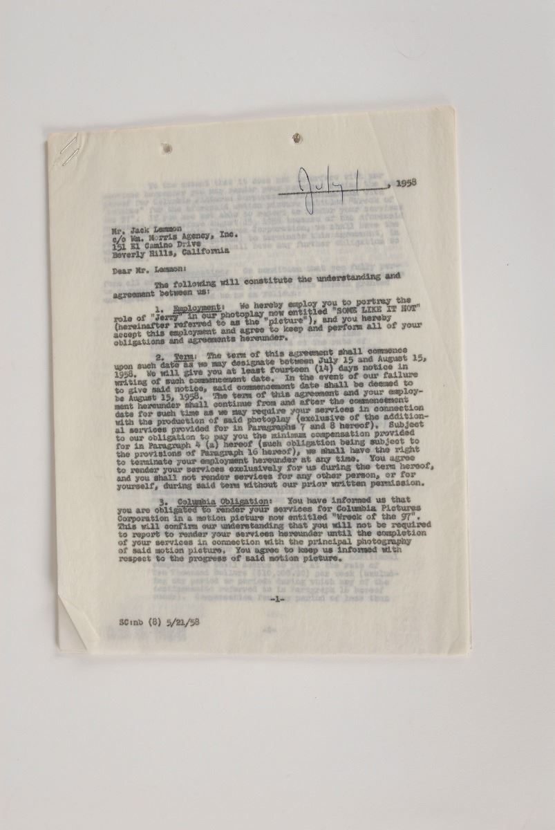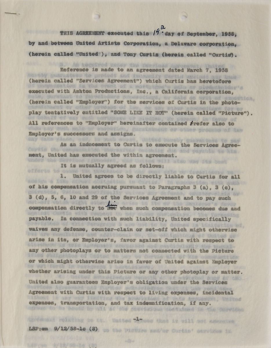 Pair of DSs: an inducement to an agreement between United Artists and Tony Curtis related to the latter’s services in “the photoplay tentatively entitled ‘Some Like It Hot,’” September 19, 1958, signed at the conclusion by Curtis; and an agreement between Ashton Productions and Jack Lemmon in which the latter agrees to “portray the role of ‘Jerry’” in the photoplay “now entitled ‘Some Like It Hot,’” July 1, 1958, signed at the conclusion by Lemmon. Also includes agreement contracts related to the referenced film, individually signed by actor George Raft and actress Paula Strasberg, as well as a letter signed by composer Leopold Stokowski. In overall fine condition.