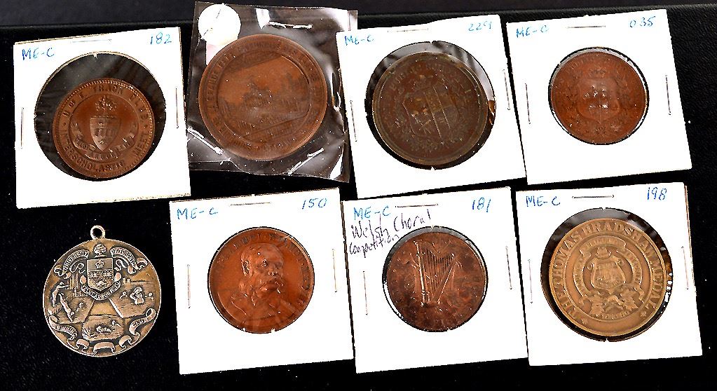 (1)- St. Jean Baptiste Society, Ottawa, 1885, Lr.1744, CH#2865-55, Ae, 38mm; (2)- The Samuel Wilmot Medal, New Castle, Ontario, Ae, 31mm; (3)- Harp at centre, Ottawa Eisteddfod, or Welsh Choral competition, Ae, 29.5mm; (4)- Toronto School Board, 4 Years good conduct, 35mm, by Ellis; (5)- Toronto School Board, 8 Years good conduct, Ae, 29mm, by Ellis; (6)- The Thomas Bradshaw Medal, Central High School of Commerce, Toronto, Ae, 35mm; (7)- University of Toronto, Swimming Club, Ar, 34mm; (8)- U. Of T. Track Club, Interscholastic Meet, Ae, 30.5mm; VF to EF, Total of 8 medals.