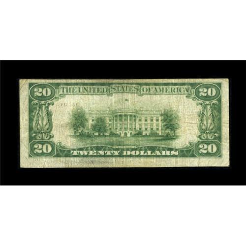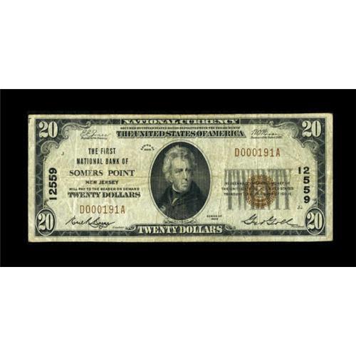 <B>Somers Point, NJ</B></I> - $20 1929 Ty. 1 <B>The First NB</B></I> Ch. # 12559<BR> This is the first time we have ever had the opportunity to offer a note from this hotly contested Atlantic County locale. This tiny institution struggled through nine years of existence before expiring in the depths of the Depression. Opting to issue small size only, this is just the sixth piece to be reported to the census. Grading a pleasing and evenly circulated <B>Fine</B></I>, it is sure to excite the numerous collectors of this part of New Jersey.<BR><BR><b>Shipping:</b> Coins & Currency (<a target="_blank" href="http://www.heritageauctions.com/common/shipping.php">view shipping information</a>)